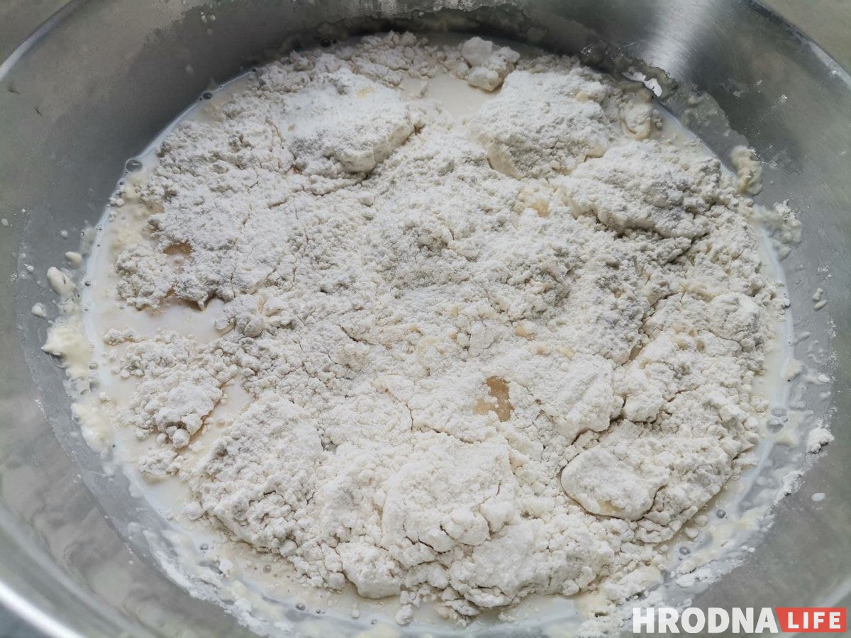 - Выліваем малако і ваду, высыпаем 2 шклянкі мукі, змешваем. Затым дадаем астатнюю муку. Цеста вымешваюць да аднастайнасці.