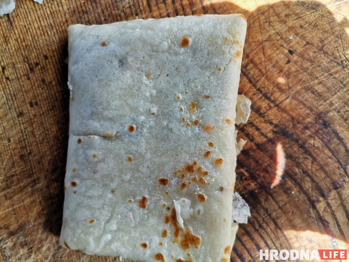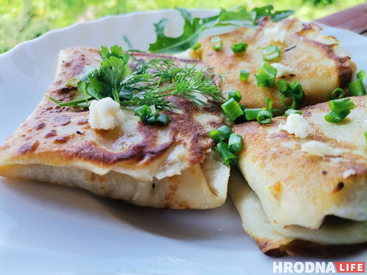 На кожны блінец выкладваем крыху начынкі і закладаем канверцікам.
