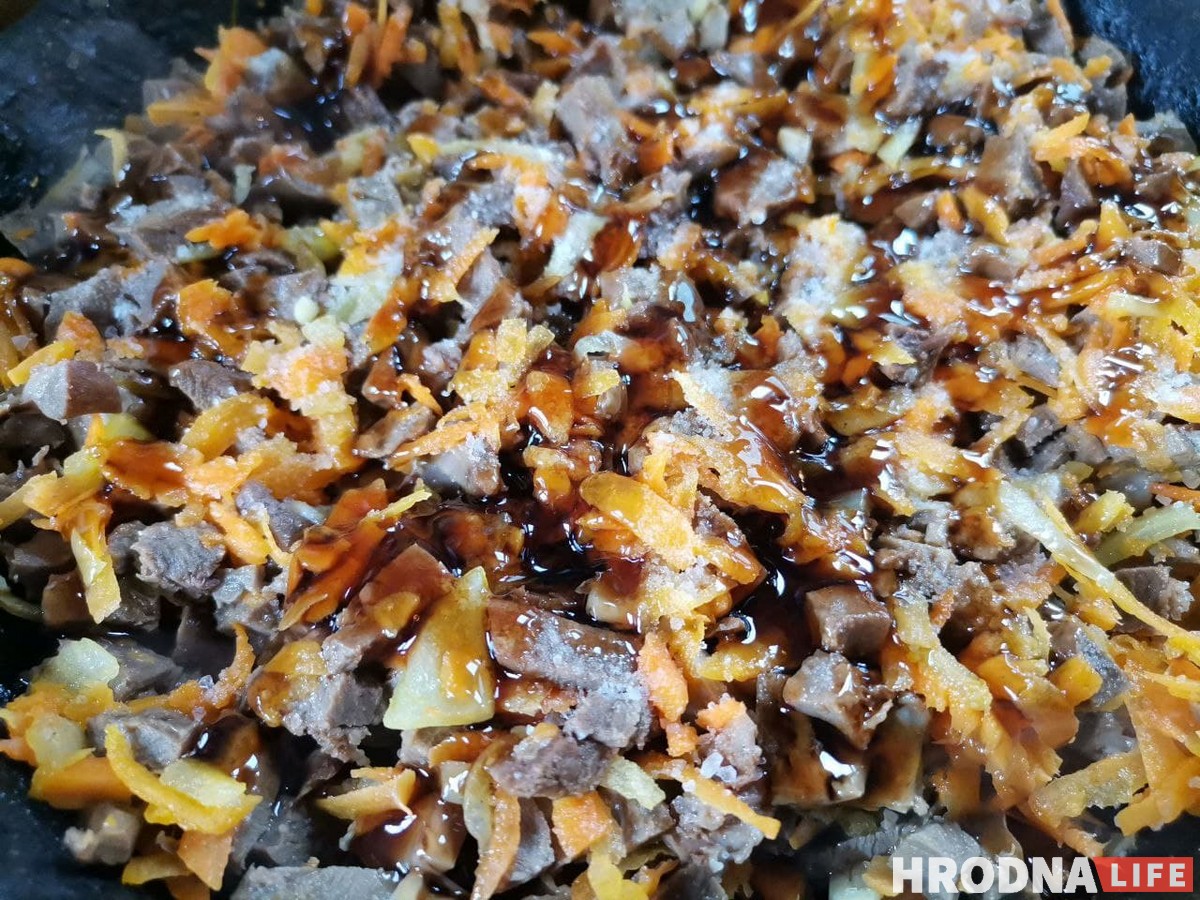 2. Разаграваем патэльню, наліваем сланечнікавы алей і закладваем цыбулю з морквай. Абсмажваем 4 хвіліны. Затым дадаем нарэзанае сэрца. Соль і прыправы – на смак.