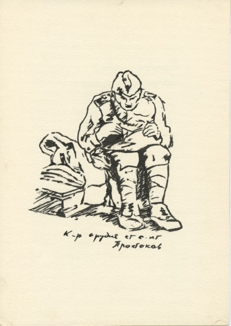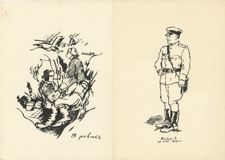 На абароце знойдзеных у Гродне малюнкаў – подпісы, зробленыя следам за пісьменнікам: “Камбат 2. Старэйшы лейтэнант Ахрын. 1945 г.”; “Камандзір гарматы старэйшы сяржант Прастакоў. Таксама рэальная асоба з гарматнага разліку. 1943 г.”, “У раўчуку Сокале. Тут адлюстраваны сюжэт з 4-х асоб: дзяжурны ля гарматнага разліку; ў дазоры; не спіць; баец адпачывае. 1944 г.”.
