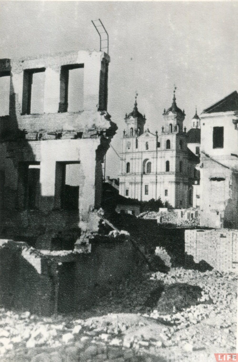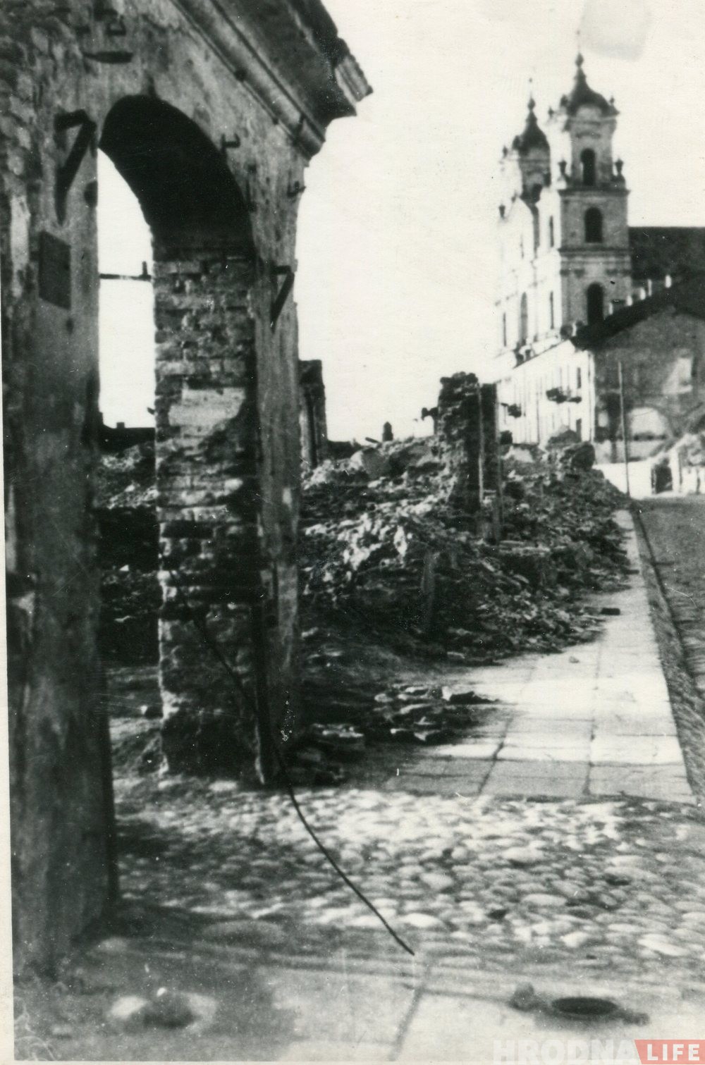 Падчас Другой сусветнай вайны была разбурана значная частка цэнтра горада. Для параўнання паказваем здымак цэнтра 1930-х гг. На месцы вялікага квартала ў левай частцы фота, ніжэй Фары Вітаўта, сёння сквер.