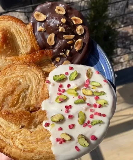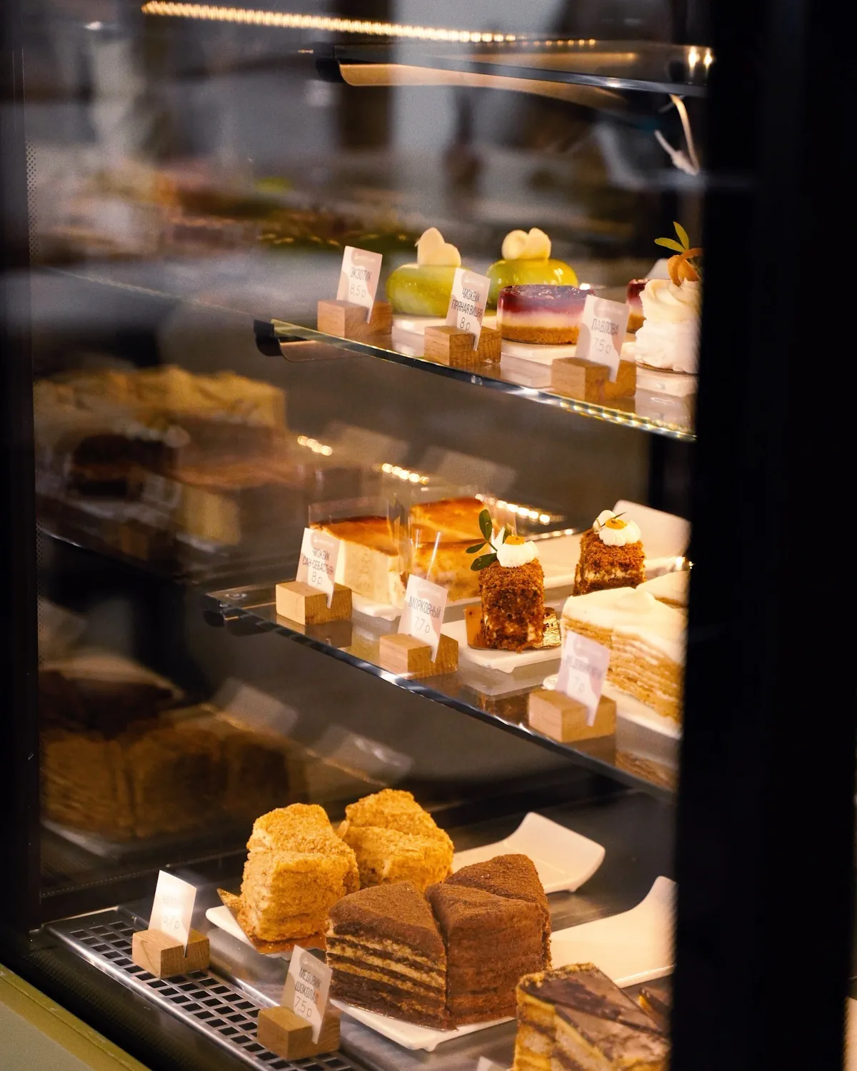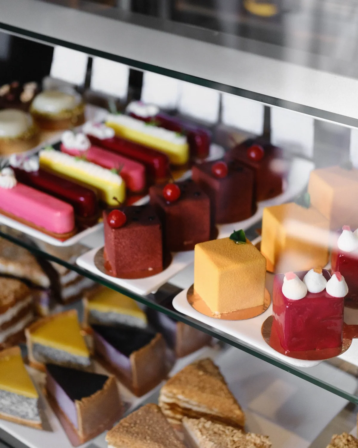 З’есці можна выпечку ўласнай вытворчасці. На вітрынах кавярні знойдзеце шмат прыгожых пірожных. Таксама прапануюць тарты і наборы пірожных на замову. Па двух адрасах ёсць столікі на вуліцы.