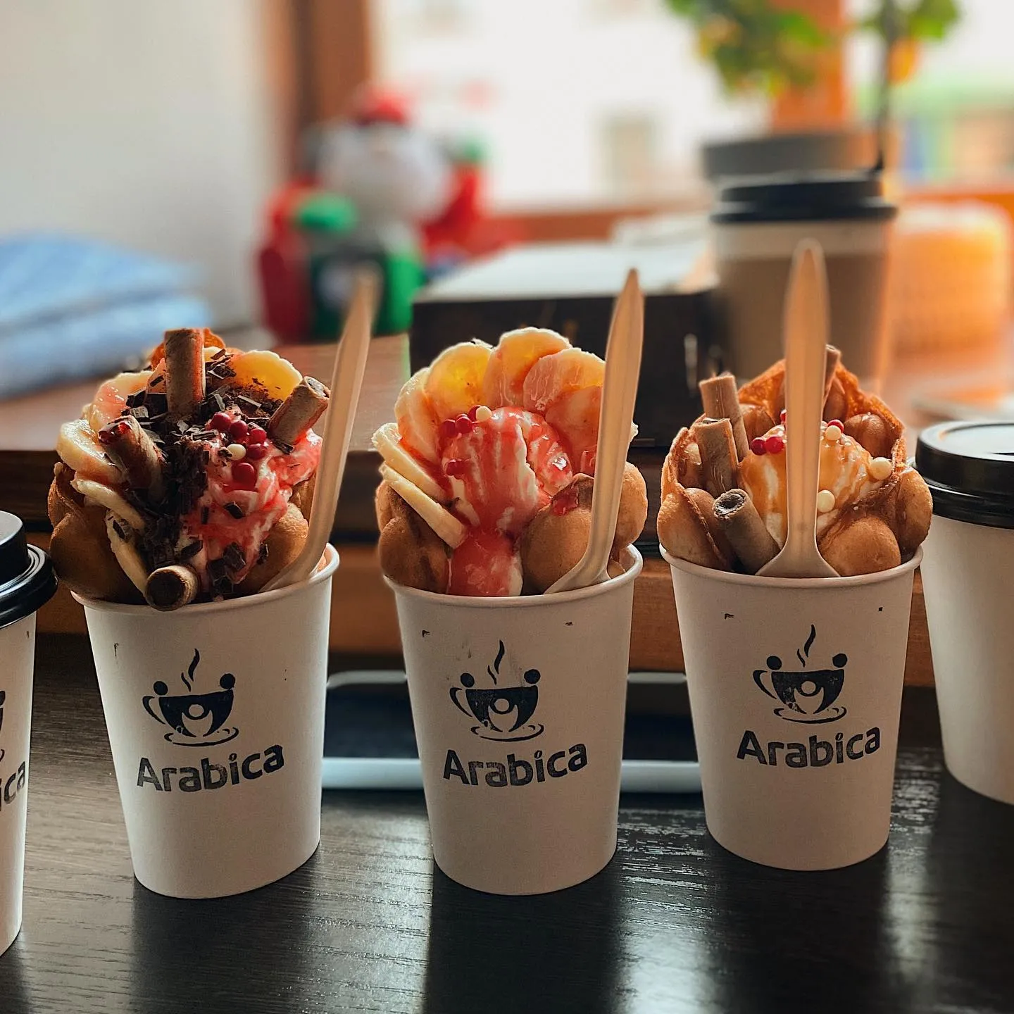 У меню знойдзеце розныя гатункі гарбаты і кавы. Фішка кавярні – ганконскія вафлі з рознымі начыннямі, напаўняльнікамі і сіропамі. З 25 траўня ў “Арабіцы” падаюць навінку – каву ў вафельным кубачку, пакрытым цёмным шакаладам. Каштуе навінка 6 рублёў.