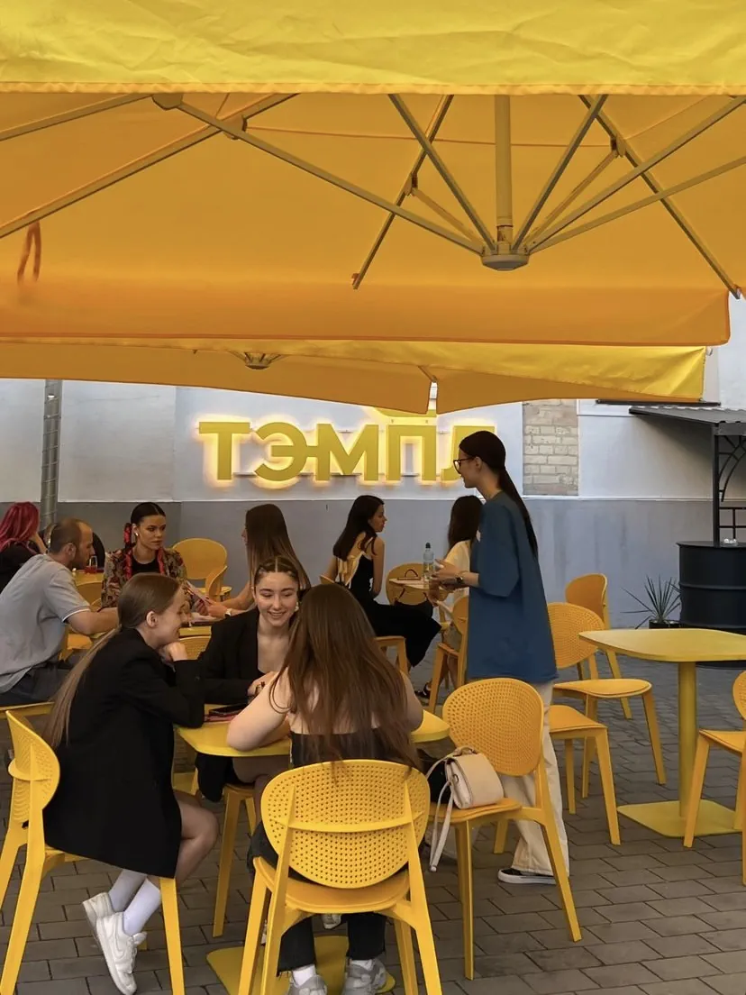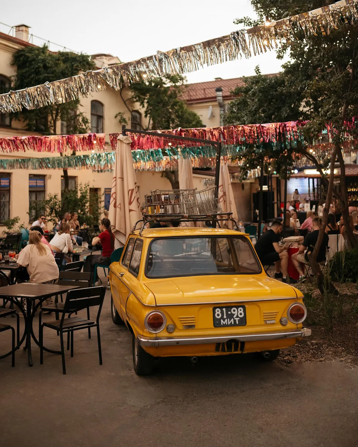 Дворык кавярні – папулярнае тусовачнае месца, а прыпаркаваная там жоўтая машына – часты атрыбут фатаграфій у турыстаў.