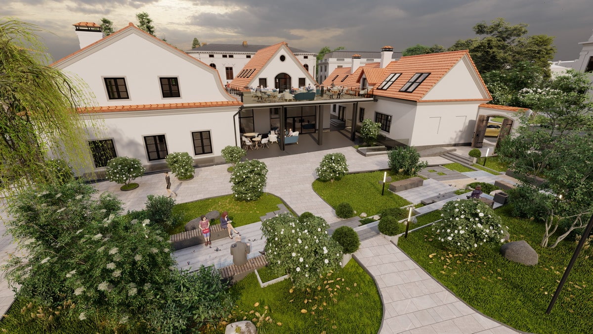 Будынкі пакрытыя глінянай чарапіцай, аканіцы, дзверы, брамы зробленыя з натуральнага дуба. Усе дэталі ўзгаднялі з Міністэрствам культуры. “Калі там былі дзверы напалову драўляныя, напалову са шкленнем і на ноч зачыняліся аканіцамі – мы гэта ўзнавілі. Калі былі драўляная брама – мы яе зрабілі, і пасадзілі на каваныя завесы”, – распавёў Хрусцель.