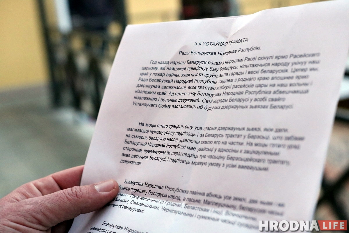 – У 1918 годзе ва ўмовах нямецкай акупацыі ў Мінску была абвешчана Беларуская Народная Рэспубліка, – распавядае лідар руха БНФ у Гродне Вадзім Саранчукоў. – Не магу сказаць, што прамая акупацыя захавалася і зараз, але тыя свабоды, дэмакратычныя нормы, інстытуты, якія былі закладзенныя ў тыя часы, так і не рэалізаваныя да канца. Таму мы працягваем і пацвярджаем прыхільнасць да тых ідэалаў. Сёння сімвалічна зачыталі ўстаўную грамату БНР і заяўляем, што ўся наша дзейнасць скіравана менавіта на дасягненнях тых мэтаў, якія ставілы айцы-заснавальнікі нашай дзяржавы.