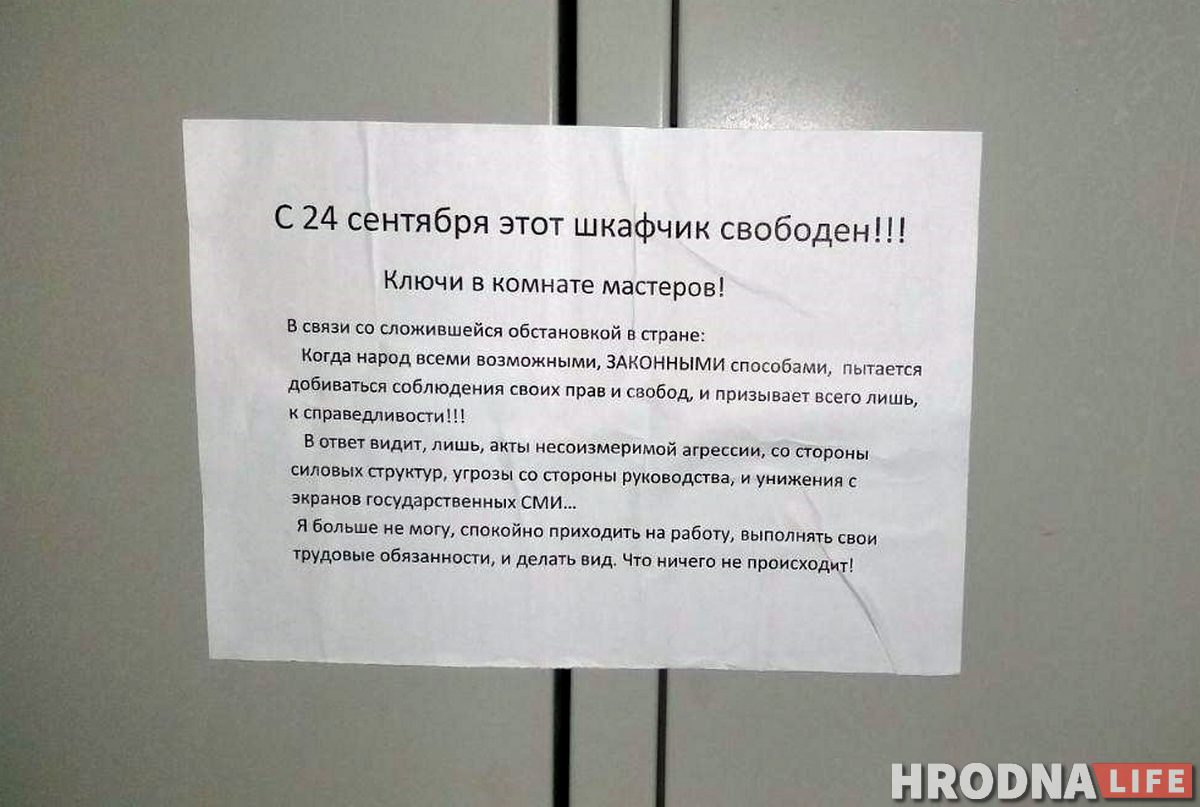 «Гэта рашэнне для мяне было адзіным правільным, трыгерам стала навіна аб інаўгурацыі Лукашэнкі», – кажа Яўген Анішчук. З 24 верасня ён перастаў выходзіць на працу на прадпрыемстве “ЗОВ-Пліта”. У распранальні на сваёй шафцы ён павесіў картку з прычынамі. Сваю гісторыю Яўген распавёў Hrodna.life.