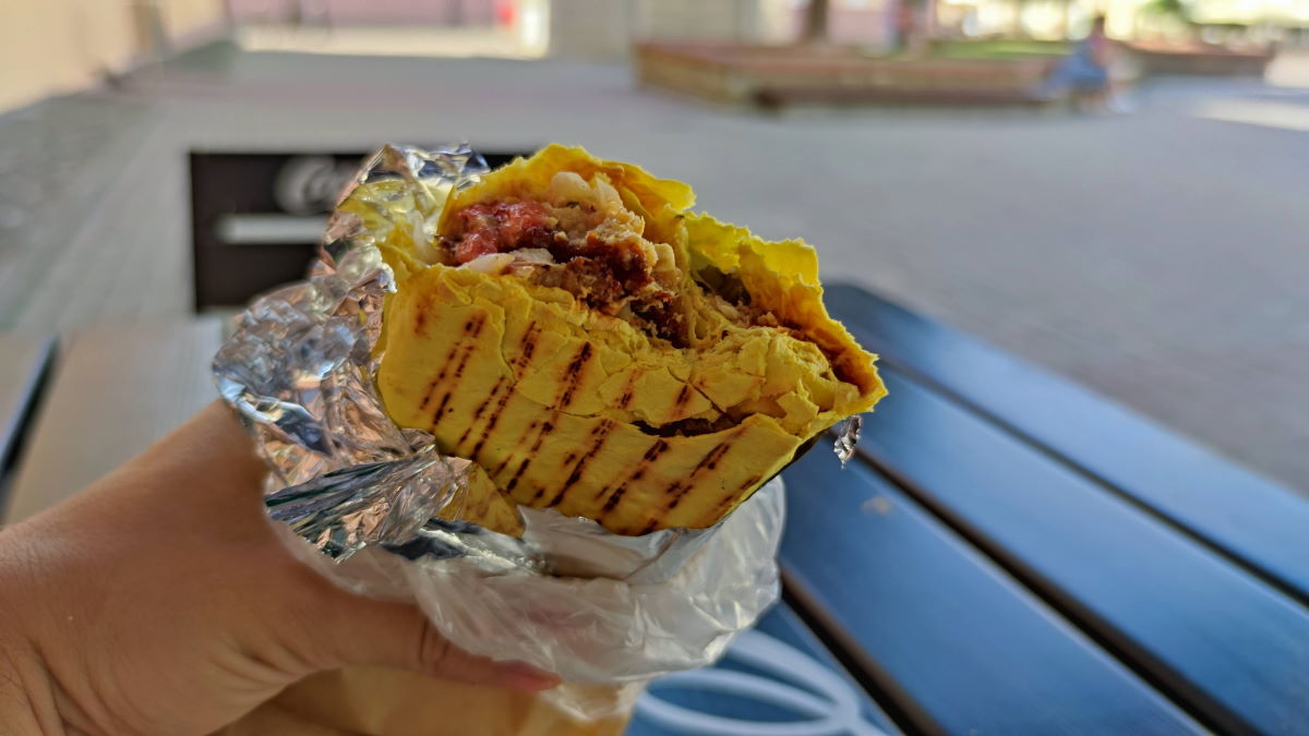 Тарціллю аддалі загорнутай у пергаментную паперу. Ляпёшка смачная, мяккая, загорнутая добра і не працякае ўнізе. У складзе, акрамя шарыкаў фалафеля, капуста, памідор, марынаваны агурок і шмат соуса. Лепш з’ядаць тарціллю хутка, пакуль яна гарачая. Як толькі страва пачне астываць, фалафель становіцца сухім. Шарыкі фалафеля былі трохі перасмажаныя – скарыначка хутчэй карычневая, чым залацістая.
