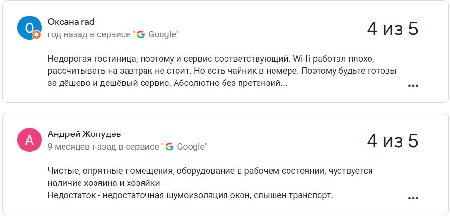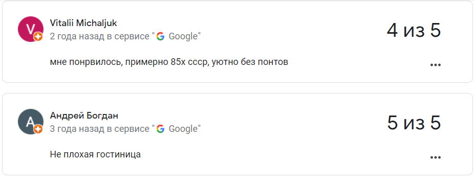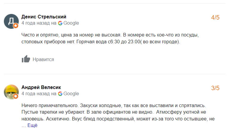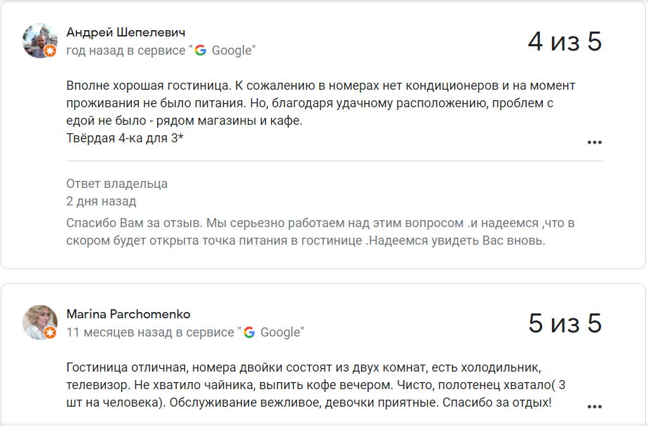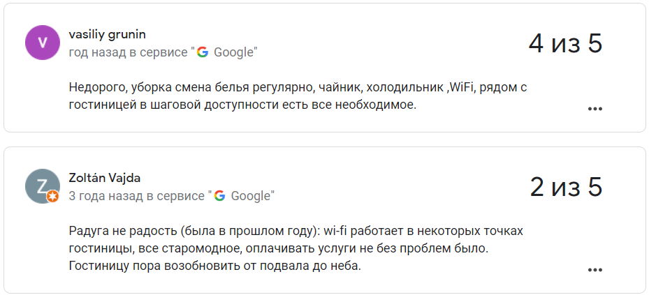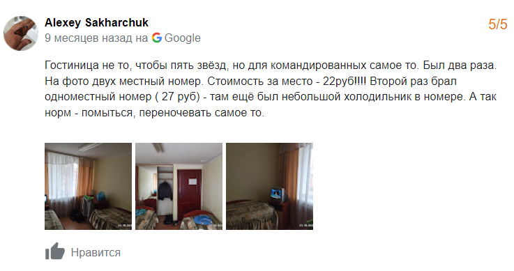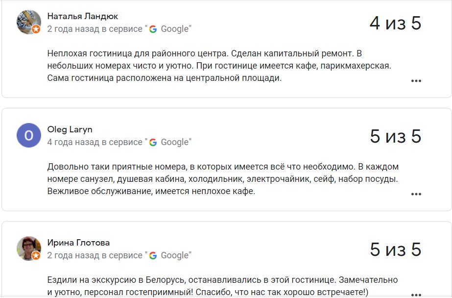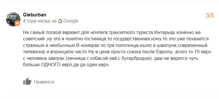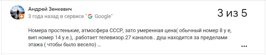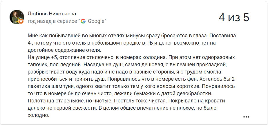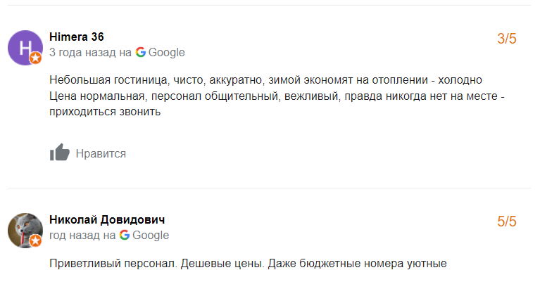 Сярэдняя адзнака гасцініцы ў Google – 3,5 з 5.
