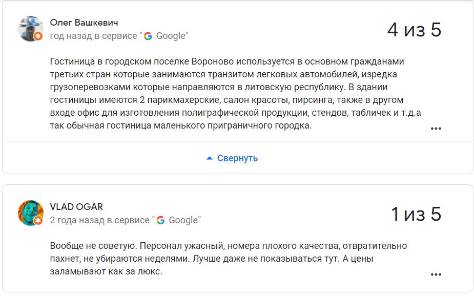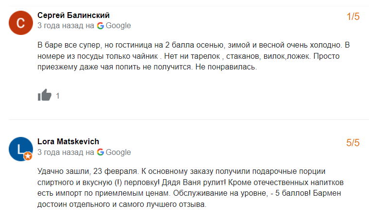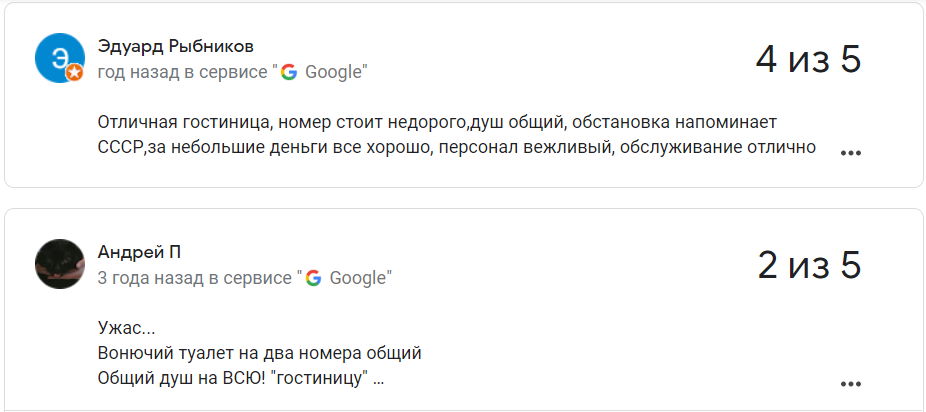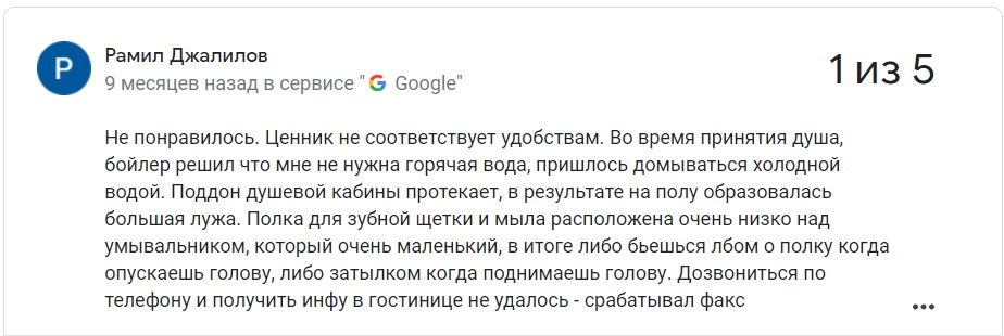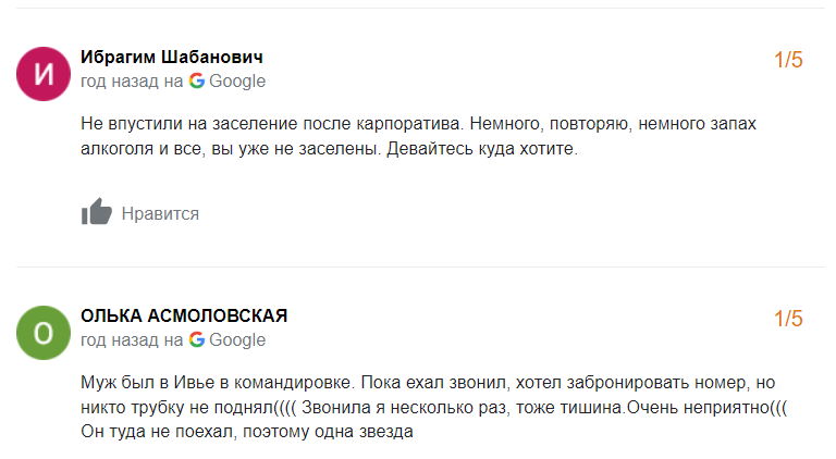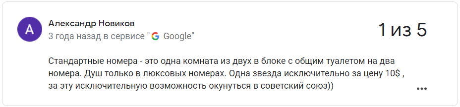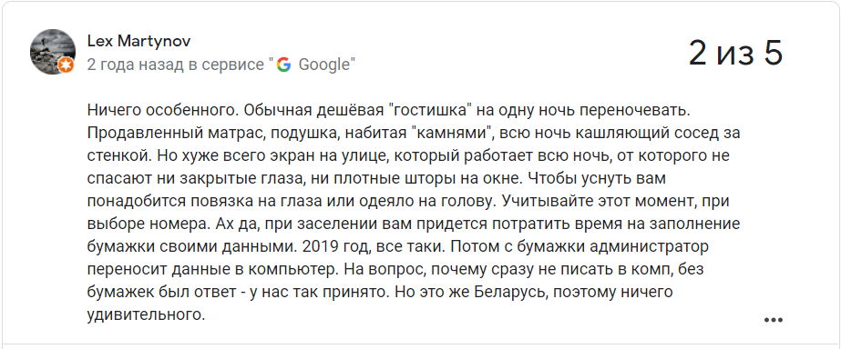 Сярэдняя адзнака гасцініцы ў Google – 2,7 з 5.