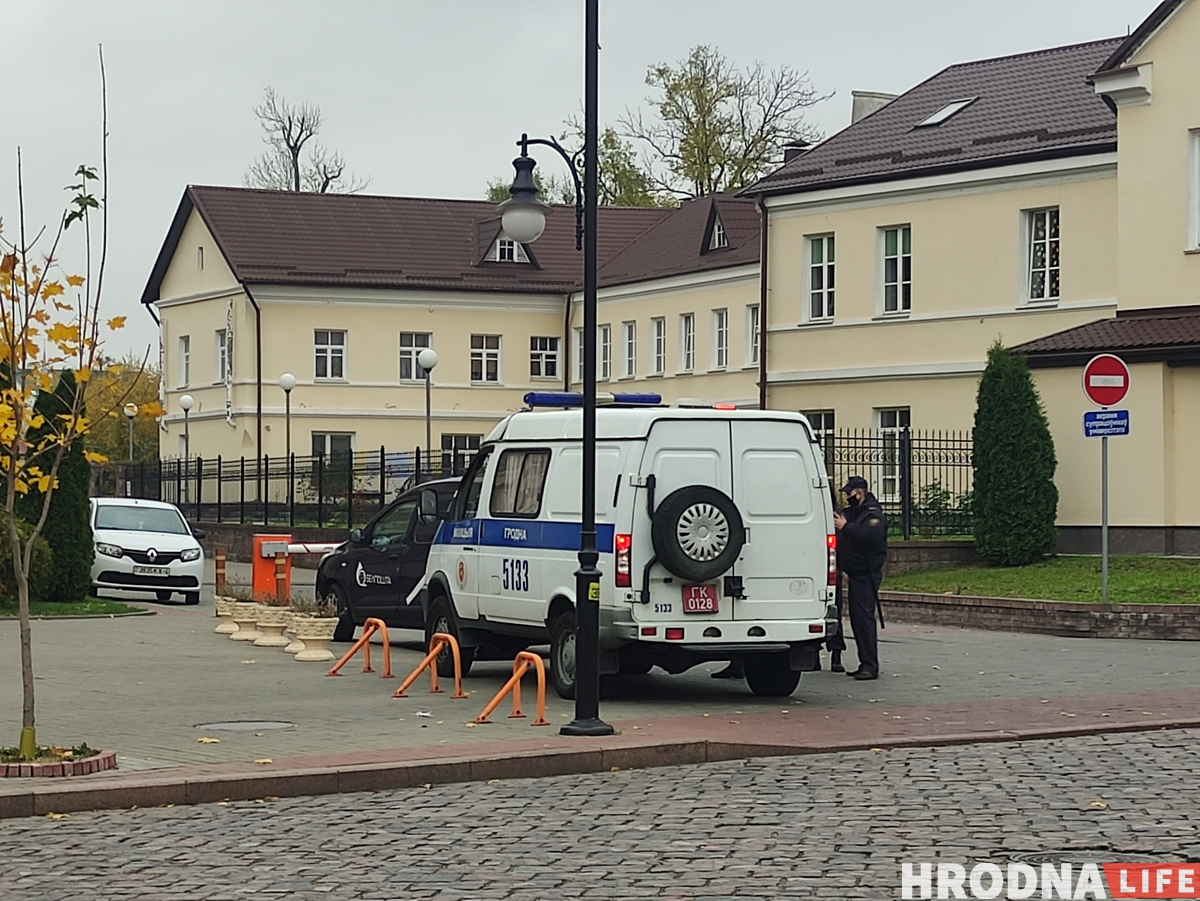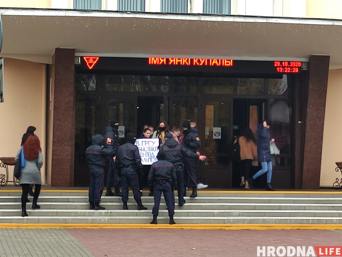 26 октября. В день “всеобщей забастовки” утром 26 октября администрация начала проверять присутствие учащихся на парах. Около 11.30 студенты собрались на перемене в главном корпусе на ул. Ожешко, 22. Они скандировали “Один за всех, всего за одного”, “Гродно Азот”. Студенты принесли бело-красно-белые флаги с символикой вуза. Около 12.00 студенты в своем Telegram-канале сообщили, что под университет приехала милиция. Возле здания студенты заметили автобус с силовиками. Сборы на следующих переменах они отменили ради своей безопасности.