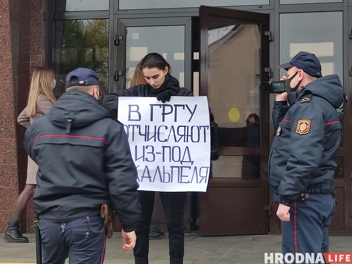 29 октября сотрудники милиции задержали бывшую студентку Варвару Гринюк во время одиночного пикета с плакатом “В ГрГУ отчисляют из-под скальпеля”. Студентку Факультета искусств и дизайна Гродненского государственного университета имени Янки Купалы отчислили 14 октября 2020 года за пропуски. В этот день она легла на операцию, к которой готовилась в течение месяца. У девушки есть медицинские справки с 17 сентября, но показать их администрации она не успела.