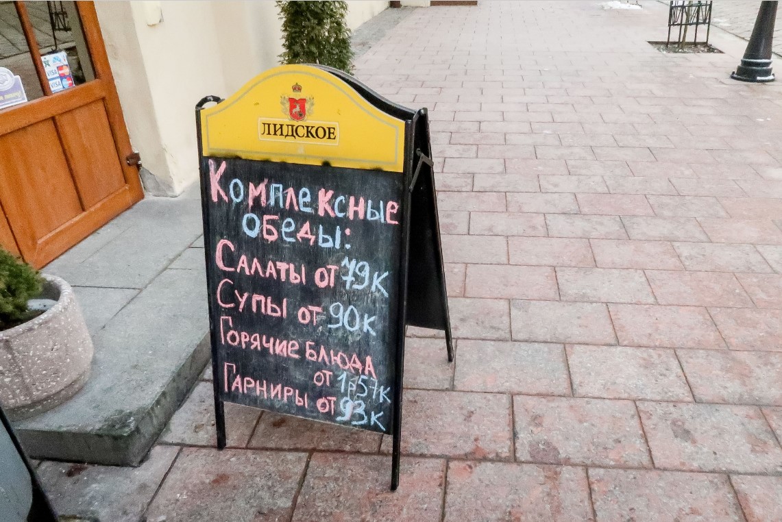 У цэнтры Гродна поўна кафэ і рэстаранаў: выбар вялікі [гродзенцы ў гэтым не ўпэўненыя, хаця зрухі ў апошнія гады ёсць – Hrodna.life]. Праўда, і кошты ў іх розныя. Ля аднаго кафэ стаіць стэнд, на ім наступныя прапановы: салаты – ад 0,4 еўра, супы – ад 0,45 еўра, гарачыя стравы – ад 0,9 еўра. У іншым кафэ прапануюць сняданак за 2,16 еўра, вафлі з садавінай – 2,87 еўра. У рэстаране прапаноўваюць амлет з грыбамі за 2 еўра, пірог за 1,45 еўра.