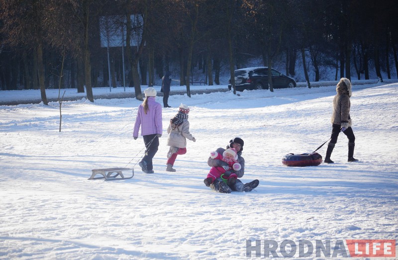 На ўскрайку леса было намнога больш людна. Горку апанавалі дзеці з санкамі, лядзянкамі і “ватрушкамі”. Бацькі некаторых з дзяцей таксама з’язджалі з горкі разам з малымі.