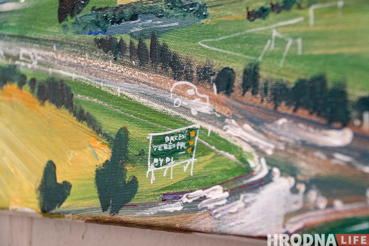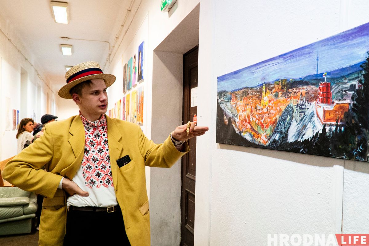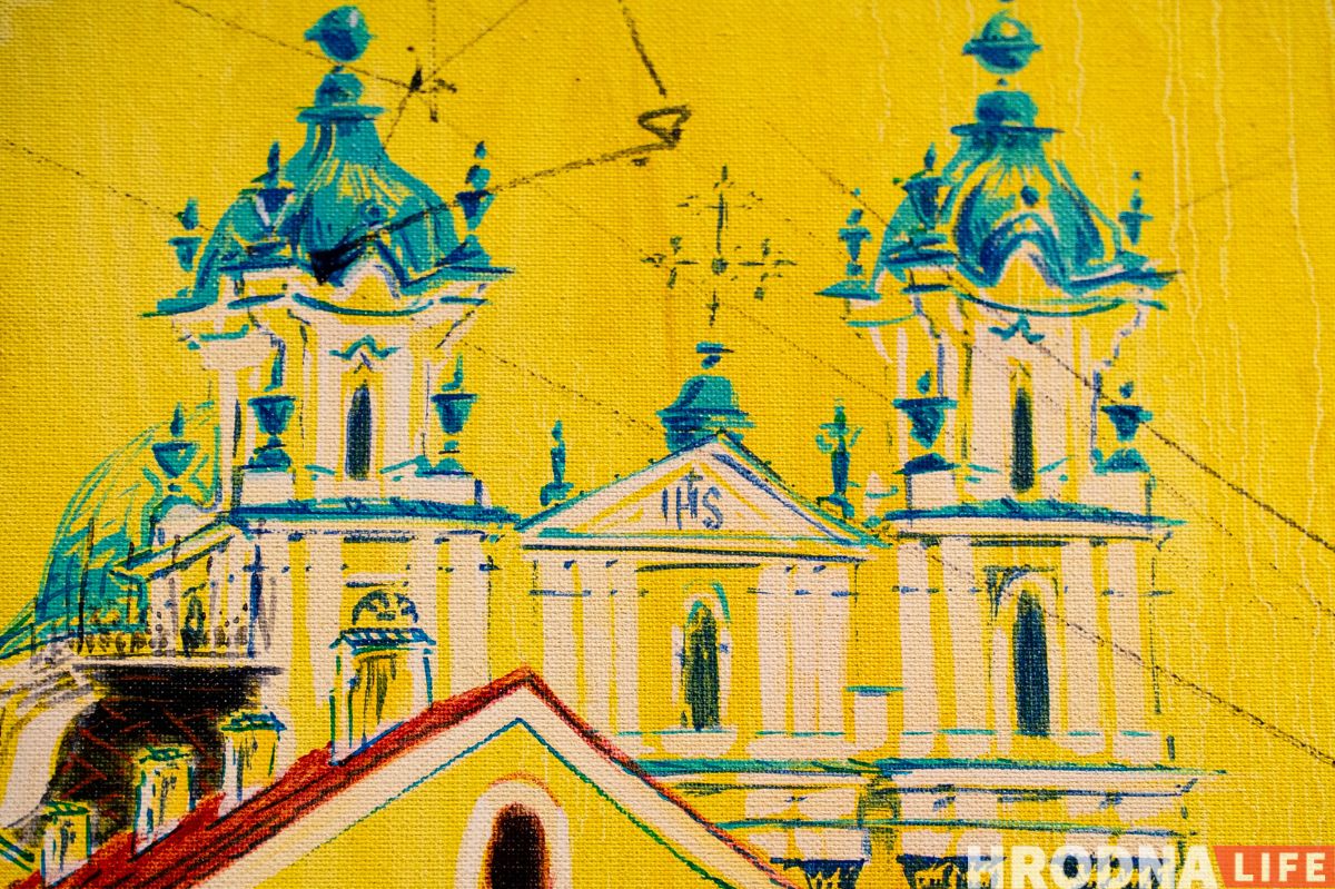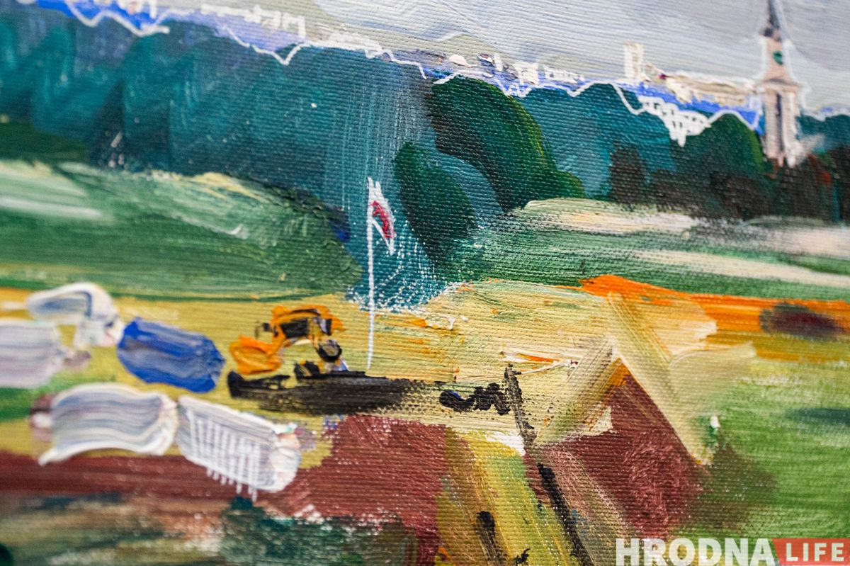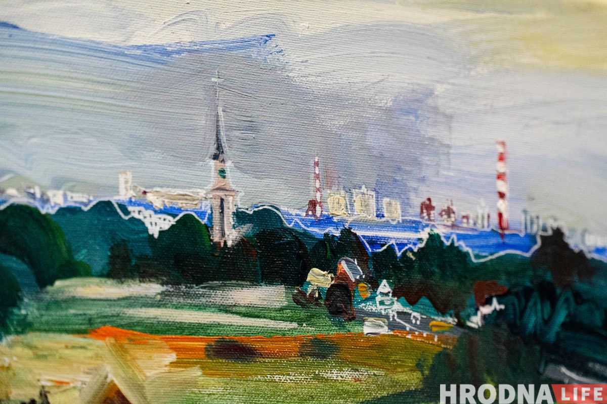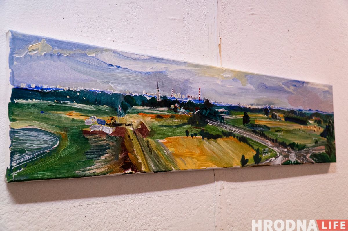 Сярод пейзажаў на выставе ёсць выявы Гродна. “Вялікая карціна Гародні – два метры на 60 см. Яна дзесьці на тры чвэрці зробленая, але прафесар сказаў, што карціна на кожным сваім этапе мусіць выглядаць завершана. Нават калі для цябе яна не завершаная. На гэтым этапе яна завершаная”, — тлумачыць Яраслаў. — Адна траціна – стары горад, дзве траціны – вялікая тэлевежа. Бо для мяне з дзяцінства гэта штосьці вялікае, такі іспалін, які заўсёды бачу. Мне заўжды было цікава на яе глядзець. Мне яна нагадвала Эйфелеву вежу”.