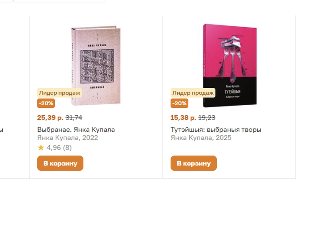 Такім чынам, зборнік твораў у чатырох тамах Быкава, тры кнігі Карпюка і дзве кнігі вершаў Багдановіча можна набыць за 71 рубель.