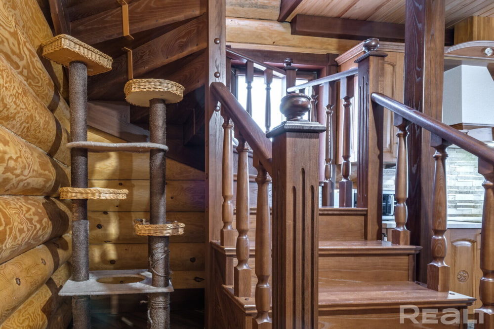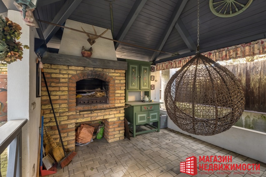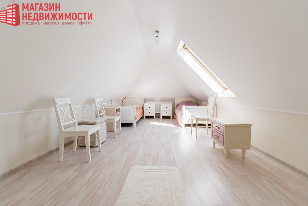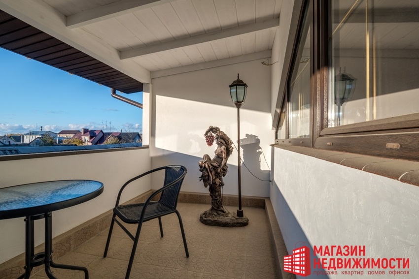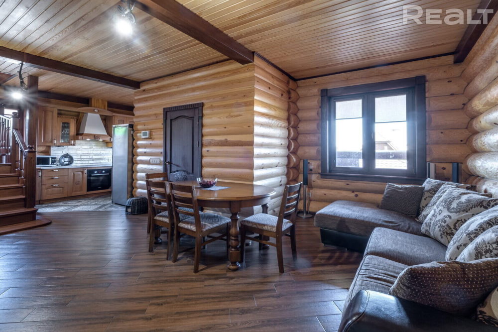 У доме ёсць прасторная гасцёўня з вокнамі ў падлогу, шэсць пакояў, гардэробная, асноўны і гасцявы санвузлы. Санвузел ёсць на кожным паверсе, лесвіца вінтавая, каваная. Другі паверх – мансардны з балконам. На ўчастку ў шэсць сотак – ландшафтны дызайн, ёсць альтанка-барбекю.