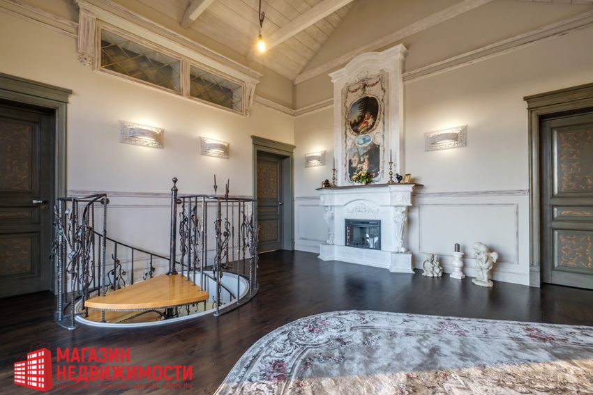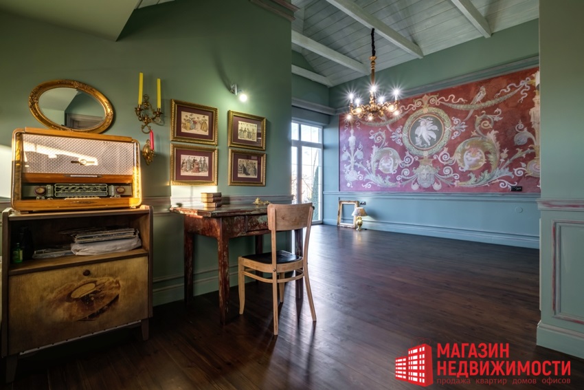 “Дызайнер абраў для афармлення інтэр’еру дома стыль, над якім не ўладны час. У аздабленні памяшканняў выкарыстаны як сучасныя, так і класічныя павевы. Традыцыйныя прадметы хатняга ўжытку і аўтарскія элементы падкрэсліваюць яго вытанчанасць. Дэкаратыўны роспіс на сценах і мэблі, драўляныя падлогі, вытанчаныя жырандолі, вырабленая на замову мэбля і прадметы інтэр’еру ствараюць неверагодную атмасферу!”- апісваюць дом у аб’яве.