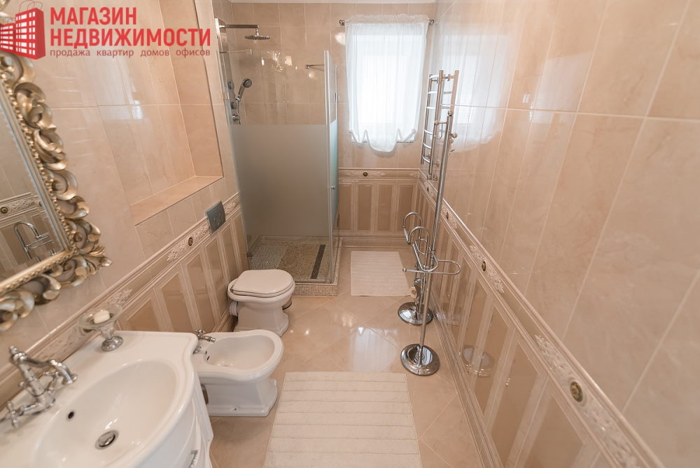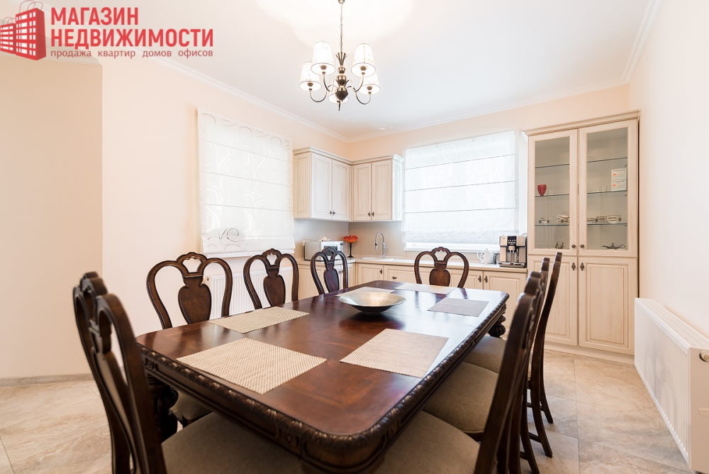 У доме – італьянская паркетная дошка, італьянская керамічная плітка і сантэхніка. Столі з дэкаратыўным аздабленнем, ляпніна. На сценах – італьянскія тканінавыя шпалеры. Дом прадаюць з тэхнікай вядомых брэндаў: ёсць пасудамыйная машына, халадзільнікі, тэлевізары, пральная машына.