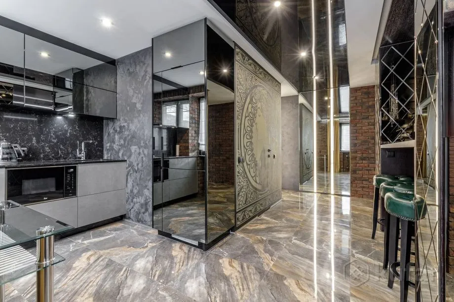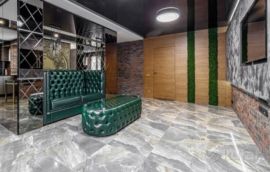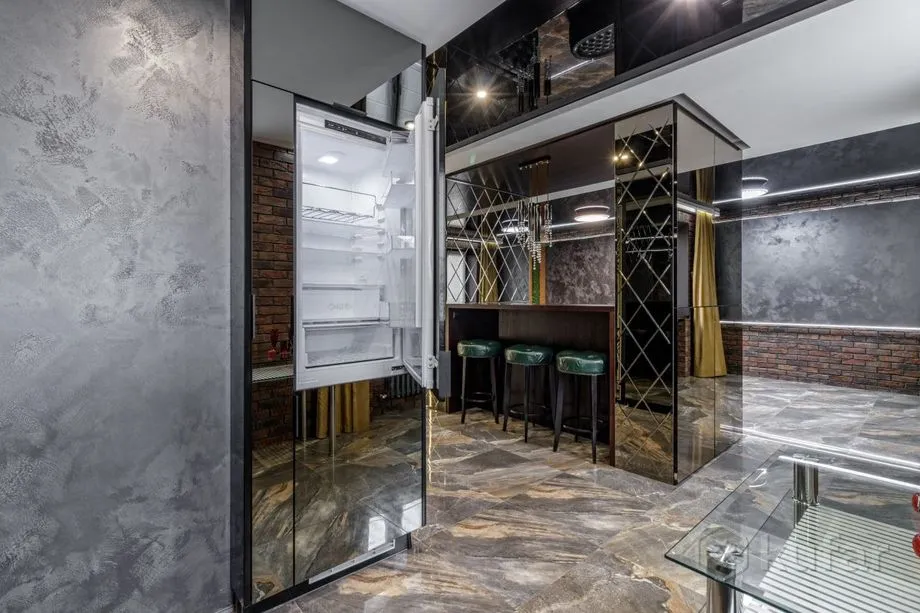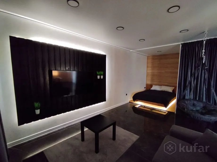 Рамонт у кватэры выкананы ў цёмных танах, якія спалучаюцца з драўляным аздабленнем. Ложак у спальні і ванны пакой з неонавай падсветкай. Ёсць балкон, кухня сумешчаная з залай.