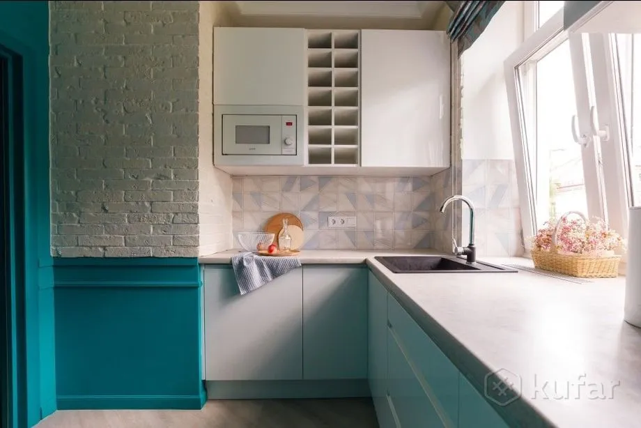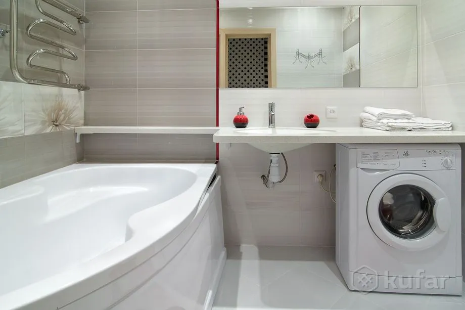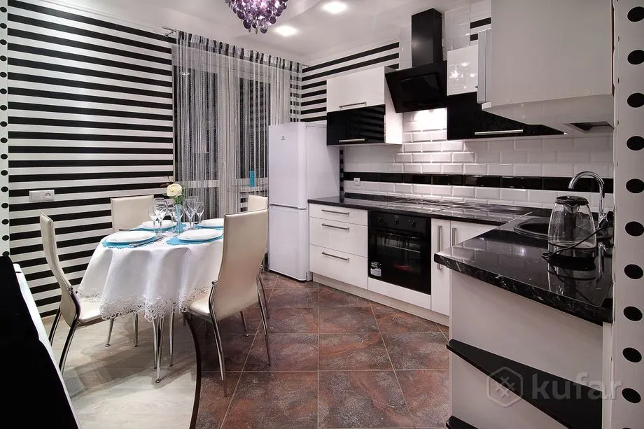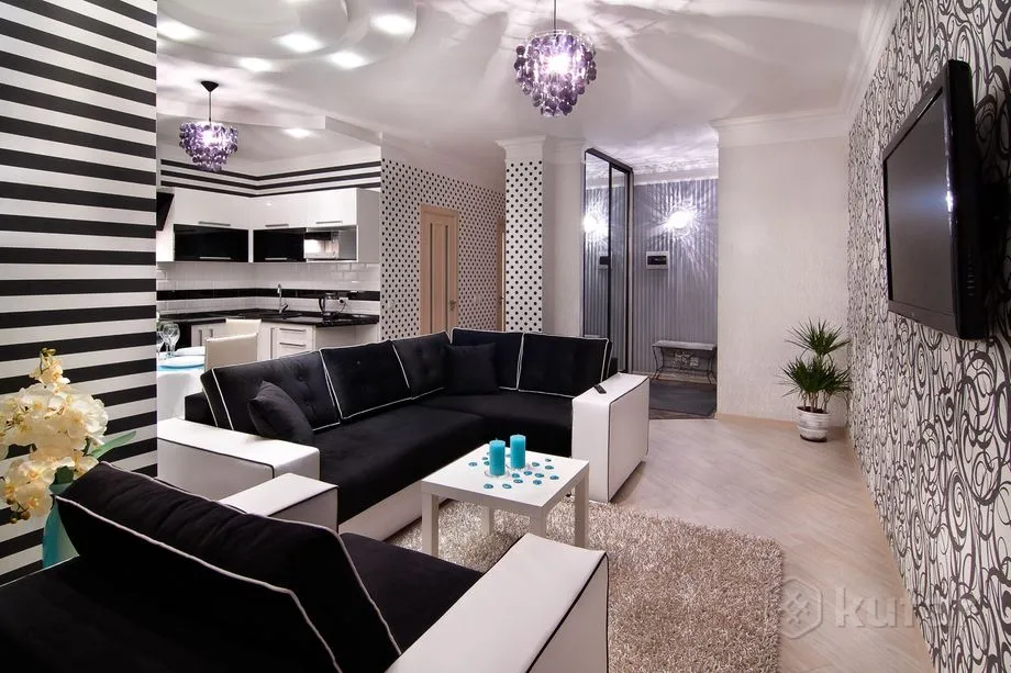 Рамонт вялікага пакоя выкананы ў чорна-белых танах, але выглядае памяшканне стракатым з-за малюнкаў на шпалерах – там спалучаюцца кропкі, палоскі і завітушкі на сценах. Гасцёўня сумешчаная з кухняй, ёсць вялікая канапа (таксама чорна-белая) і тэлевізар. Спальня выглядае як пакой з зусім іншай кватэры – бэзавыя сцены з кветкамі, белая мэбля. У санвузле стаіць вялікая кутняя ванна. Раніцай можна будзе выпіць кавы з кававаркі на кухні.