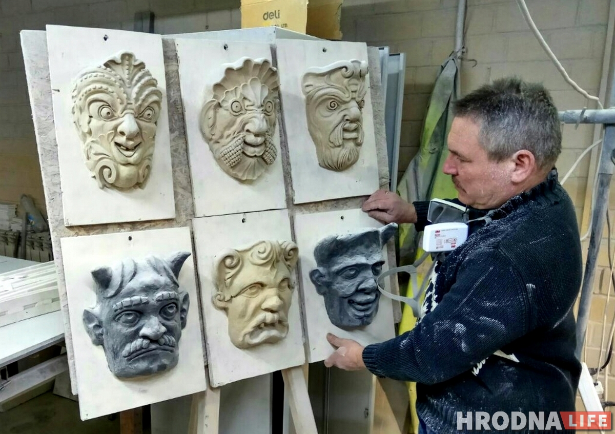 «На дадзены момант на замку заканчваецца першая чарга рэканструкцыі. Мае новыя маскароны якраз у яе і ўваходзяць. Яны будуць упрыгожваць вокны, – распавядае Сяргей. – Адкуль узяліся маскароны? Яны ў 16 стагоддзі выконвалі ролю абярэга. Імі ўпрыгожвалі палацы і замкі. Сваім жахлівым выглядам яны нібыта адганялі злых духаў. Я працую па праектнай дакументацыі Гроднаграмадзянпраекта з фотаздымкамі і чарцяжамі сапраўдных маскаронаў таго перыяду, якія захаваліся ў Еўропе з часоў Стэфана Баторыя».