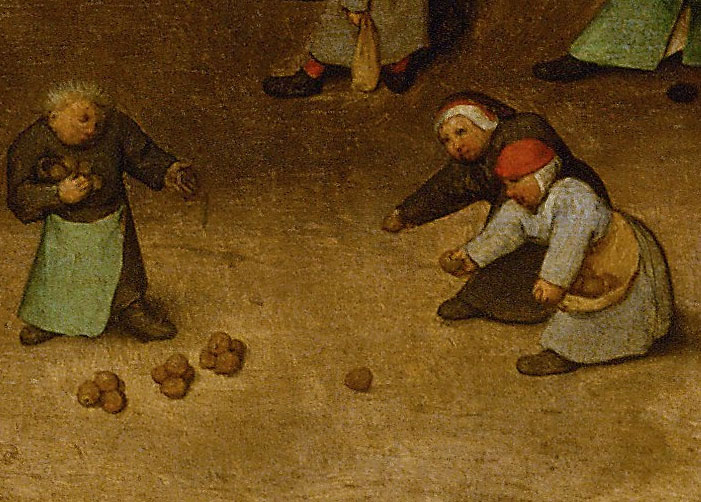 Куды весялей гуляць з сябрамі, чым адному. Таму хлопчыкі і дзяўчынкі рабілі мячыкі з анучаў ці са скуры і саломы і пачыналі калектыўныя гульні. Адна з іх называлася “ў карнача”. Кожны ўдзельнік выкопваў неглыбокую ямку і станавіўся каля яе. Адзін з гульцоў пачынаў гульню – каціў мячык праз ямкі. Той, у чыю ямку закоціцца мячык, пляскаў у далоні, а астатнія гульцы ўцякалі на пэўную дамоўленую адлегласць. Першы ж павінен быў схапіць мячык і цэліць у каго-небудзь з гульцоў. Калі гэта не ўдавалася, то яму выпадала чарга каціць мячык па ямках.Гульня у карнача з карціны П.Брэйгеля Гульня, што нагадвае сучасны хакей, на нашых землях называлася “ў качоўкі”. Спачатку рабілася качоўка – драўляны кругляшок дыяметрам сантыметраў з 10. Дзве каманды дзяцей станавіліся па розных баках вуліцы і ўзбройваліся кійкамі. Кійкі трэба было па чарзе кідаць і трапляць у качоўку такім чынам, каб яна дакацілася да каманды саперніка. Больш рухомая версія гульні называлася “була”. Тут качоўка замянялася на драўляны шар, і ўдзельнікі бегалі за ім і кійкамі заганялі на тэрыторыю іншай каманды, якая спрабавала зрабіць тое ж самае.Качоўкі, з карціны П.Брэйгеля Час ад часу ў Гродна знаходзяць надкапытныя косткі жывёл, якія калісьці былі галоўным атрыбутам гульні ў “бабкі”. Некалькі пар такіх бабак ставілі на роўным месцы ў рад – “кон”, і з абумоўленай адлегласці ўдзельнікі па чарзе збівалі іх біткай – вялікай бабкай. Збітыя косткі лічацца выйгранымі. Сустракаўся больш азартны варыянт, калі замест бабак выкладвалі піраміду з арэхаў, вакол якой праводзіцца круг – “горад”. Арэхі, выбітыя за мяжу горада, лічыліся выйгранымі. Хто прамахнуўся – дабаўляе ў піраміду арэх.
