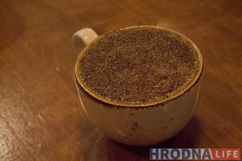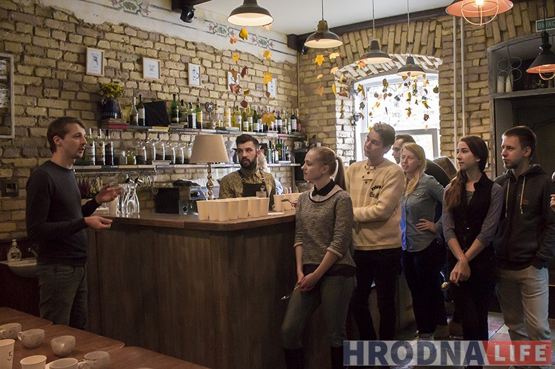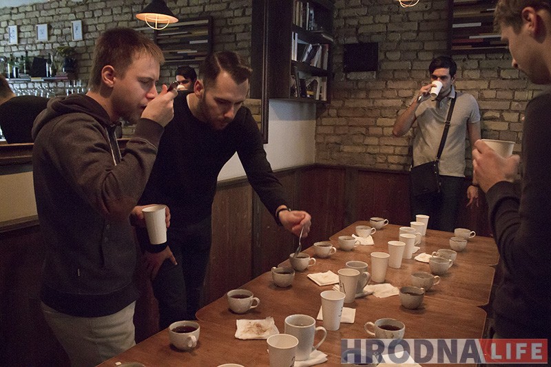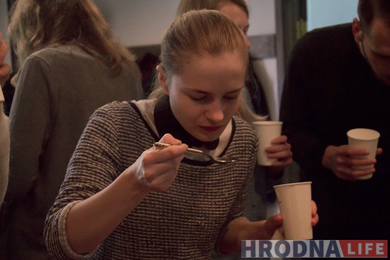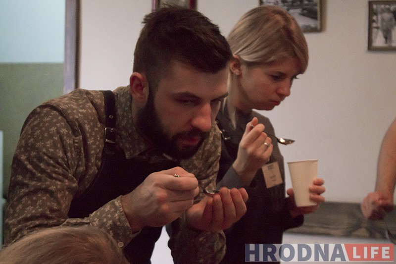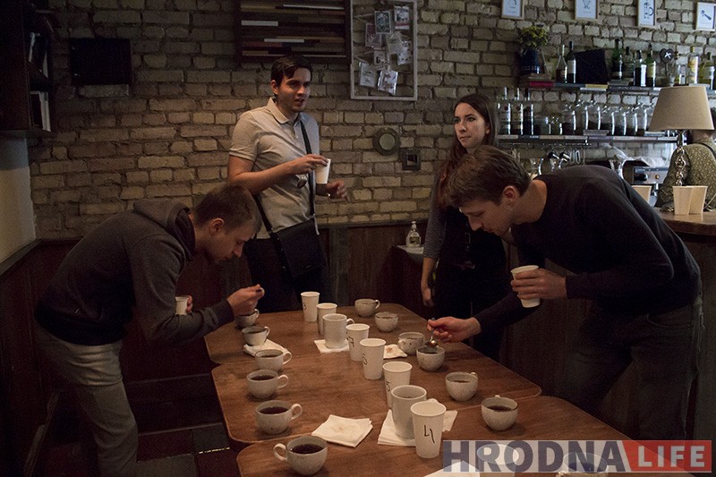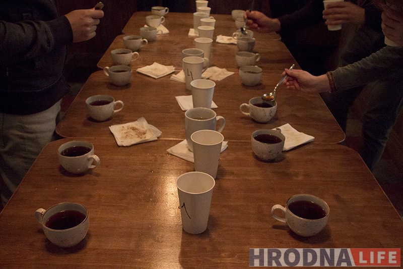 У кавярня змалолі зерне. Гродзенцы ўдыхалі водар кавы і адзначалі для сябе найпрыемнейшы пах. Затым каву залілі кіпнем з чайніка. Праз чатыры хвіліны – столькі трэба, каб кава заварылася, – здымалі плёнку. Акуратна, каб не падняць з дна кубка гушчу.