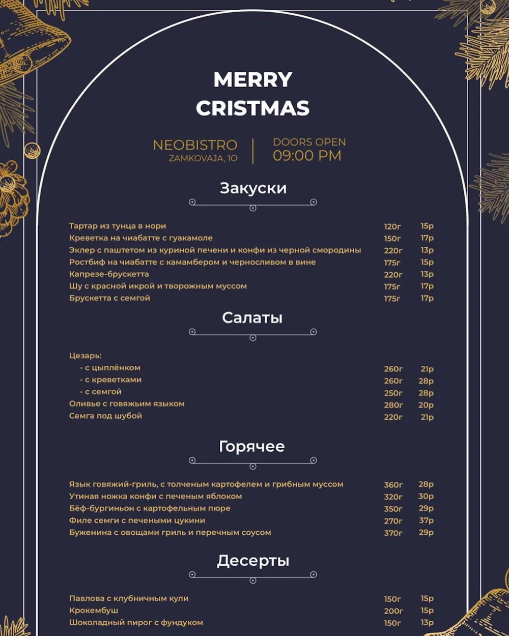 Да святаў рэстаран прапануе спецыяльнае банкетнае меню. На аднаго госця замова абыдзецца ад 70 рублёў. Таксама ёсць магчымасць забраніраваць увесь рэстаран для навагодніх карпаратываў. Індывідуальныя ўмовы па алкагольным меню.