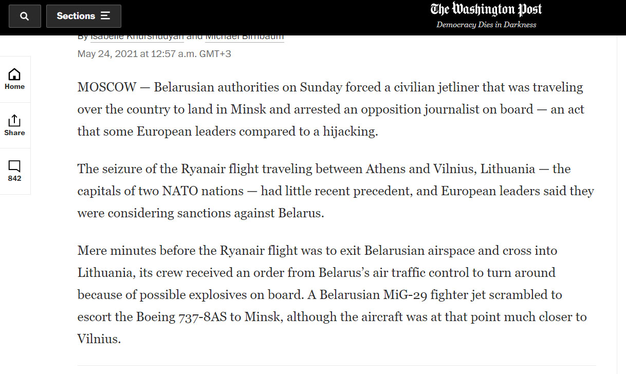 Захоп рэйса Ryanair, які ляцеў паміж Афінамі і Вільняй, Літва – сталіцамі дзвюх краін НАТА – у апошні час не меў прэцэдэнтаў. Еўрапейскія лідары заявілі, што разглядаюць магчымасць увядзення санкцый супраць Беларусі”.