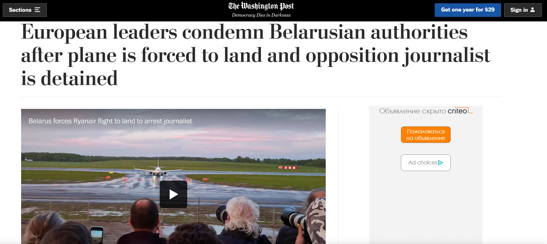 “У нядзелю беларускія ўлады вымусілі грамадзянскі самалёт, які ляцеў над краінай, прызямліцца ў Мінску і арыштавалі на борце апазіцыйнага журналіста – акт, які некаторыя еўрапейскія лідары параўноўваюць з захопам.