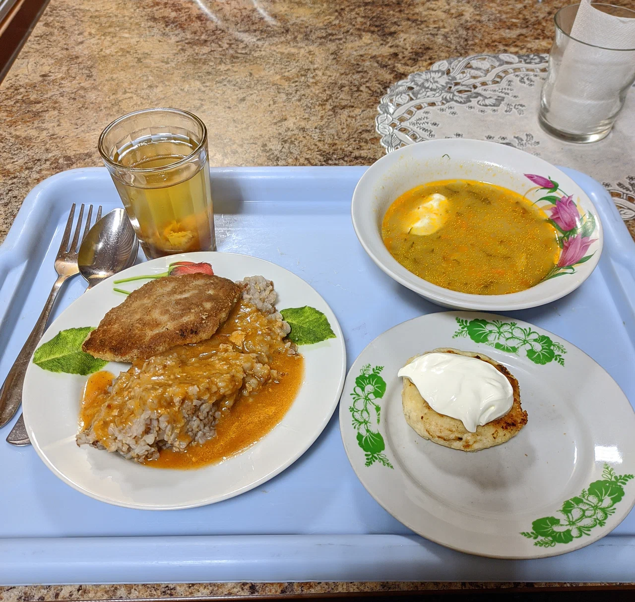 Вольга ўзяла салату з «агурочка з пупырышкамі», хек на агародніннай падушцы і маркоўны сок — абед абышоўся ў 10 руб. За халаднік, катлету з пюрэ і сок Андрэй заплаціў 12,5 руб. Ежа і абслугоўванне гродзенцу спадабаліся. Але пры ўваходзе ў будынак няма пандуса, адзначае гараджанін.