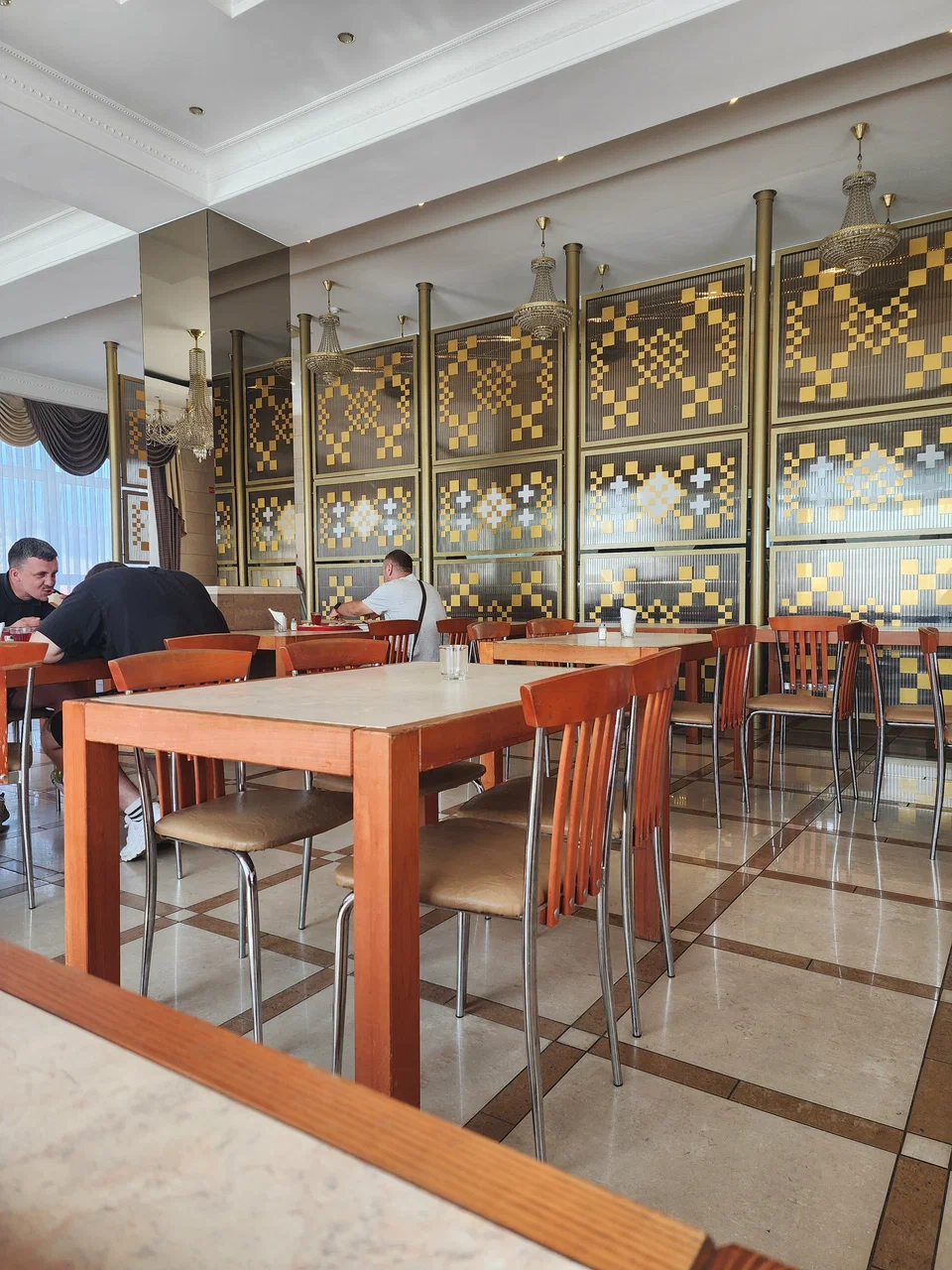 Ва ўстанове цікавы інтэр’ер: высокія белыя столі з люстрамі, стылізаванымі пад крышталь, а перагародкі на сценах упрыгожаны народным арнаментам. Дзякуючы яскраваму інтэр’еру ў сталовай нават праводзяць юбілеі і карпаратывы.