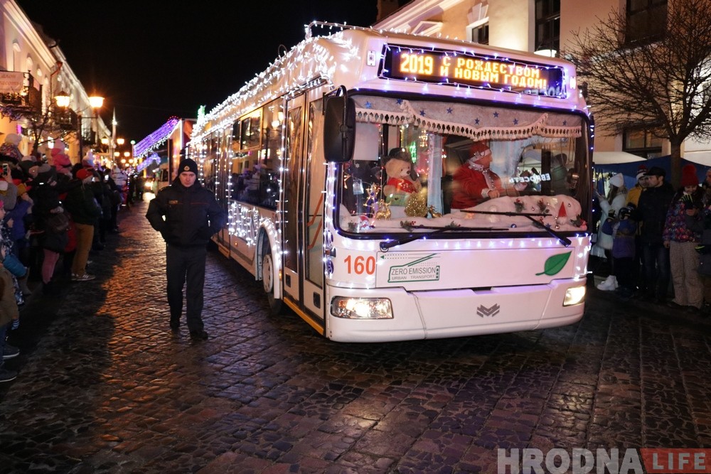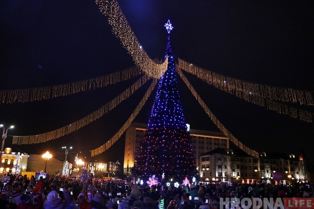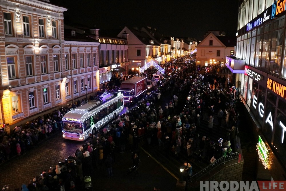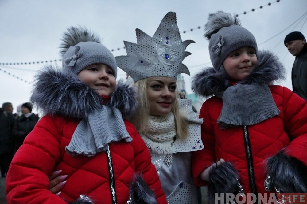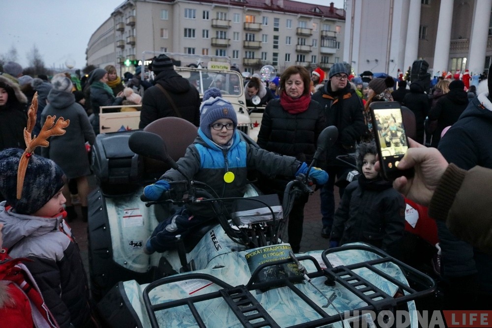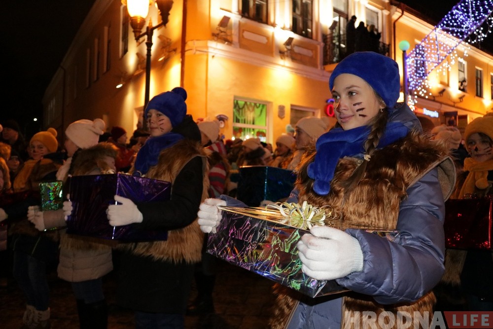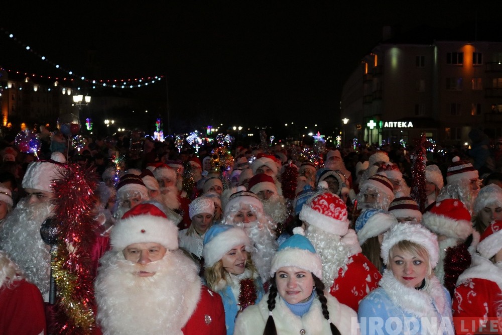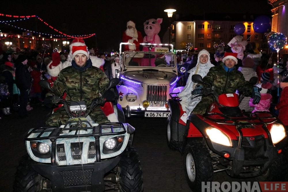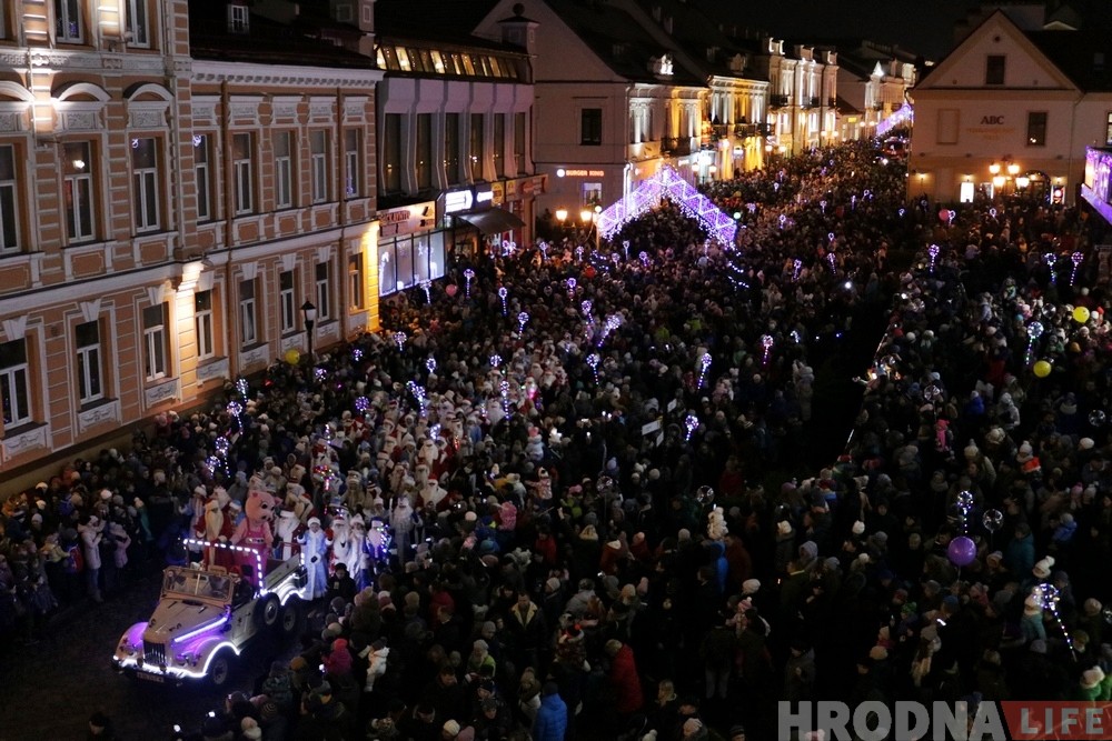 Каля 500 Дзядоў Марозаў, Снягурак і казачных персанажаў у суправаджэнні яркіх аўтамабіляў, тралейбуса, аркестра і веласіпедыстаў вечарам 15 снежня на цэнтральных плошчах Гродна ў святочнай атмасферы запалілі навагоднюнею ілюмінацыю.