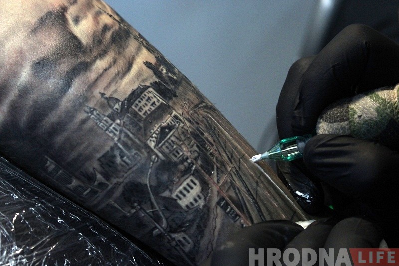 Каб зрабіць чорна-белую татуіроўку з відам Гродна майстру Дзмітрыю Мядзведзю спатрэбіліся два сеансы па некалькі гадзін. Праца сама па сабе складаная, бо раней дасведчаны татуіроўшчык панараму горада нікому не набіваў. Прадстаўленую фатаграфію майстру давялося выцягваць, каб на руцэ ўсё выглядала нармальна.