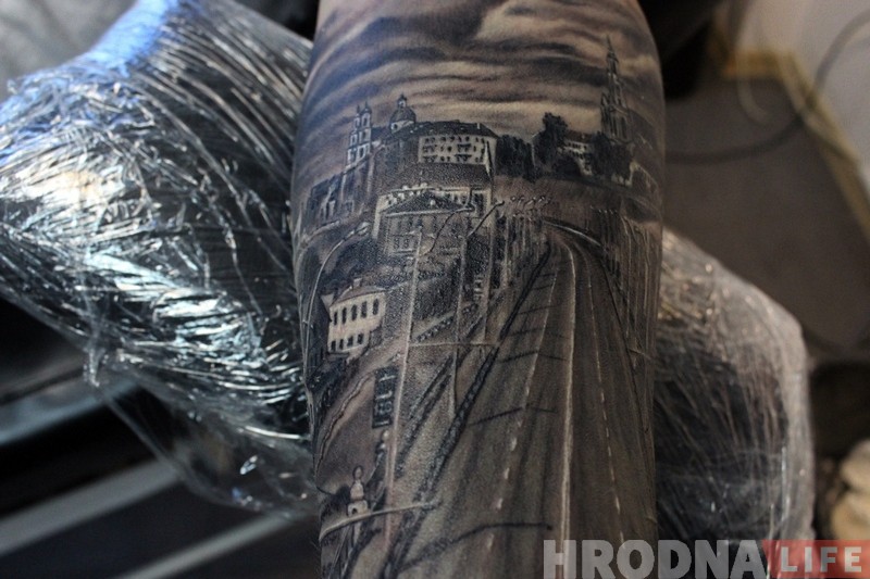 «Калі біць вакол рукі, то ў нас бы злучыліся касцёлы і атрымалася б непрыгожа. А так прыйшлося выцягваць панараму і выйшла нядрэнна, – кажа Дзмітрый Мядзведзь. – Я шмат розных татуіровак рабіў гродзенцам, але вось панараму горада яшчэ не біў. Было нешта падобнае – гербы, арнамент, але гэта не тое.