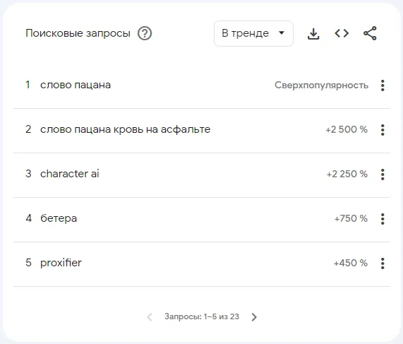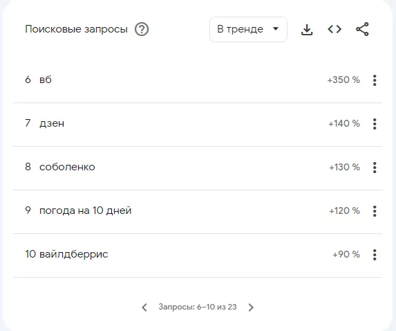Google дзеліць сваю статыстыку на “У трэндзе” і “Лідары”. У першую катэгорыю трапляюць запыты, якія раптоўна і вельмі заўважна атрымалі папулярнасць. Часта гэта новыя запыты, якія год таму проста не існавалі і па якіх карыстачы нічога не шукалі.