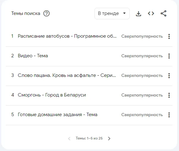 У трэндзе па тэмах пошуку на першым месцы “расклад аўтобусаў” – больш за ўсё яго шукалі ў Гродне і Слоніме. На другім – серыял «Слова пацана. Кроў на асфальце», пры гэтым больш за ўсё яго чамусьці шукалі ў Расіі і Навагрудку. Статус “звышпапулярнасць” атрымалі і запыты па тэме “гатовыя дамашнія заданні”. У дзясятцы самых папулярных тэм таксама “tabletka.by” (сэрвіс пошуку лекаў у аптэках) і “навіны Гродна”.