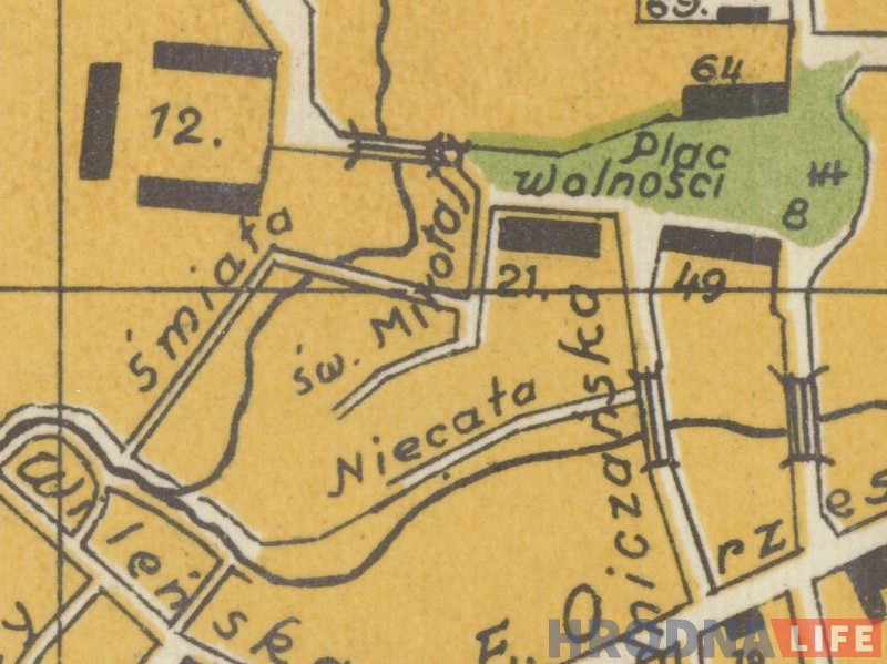 Калі глянуць на карту нашага горада пачатку ХХ ст. то ў раёне, дзе зліваюцца рэчкі Юрыздыка ды Гараднічанка, было адразу некалькі вуліц. Дзвюх з іх зусім няма. Вуліца Няцэлая прабягала за дамамі па Ажэшкі, а Смелая была ў затопленай даліне Гараднічанкі, дзе цяпер стаяць лебедзі. А вось Святога Мікалая засталася невялічкім кавалкам.