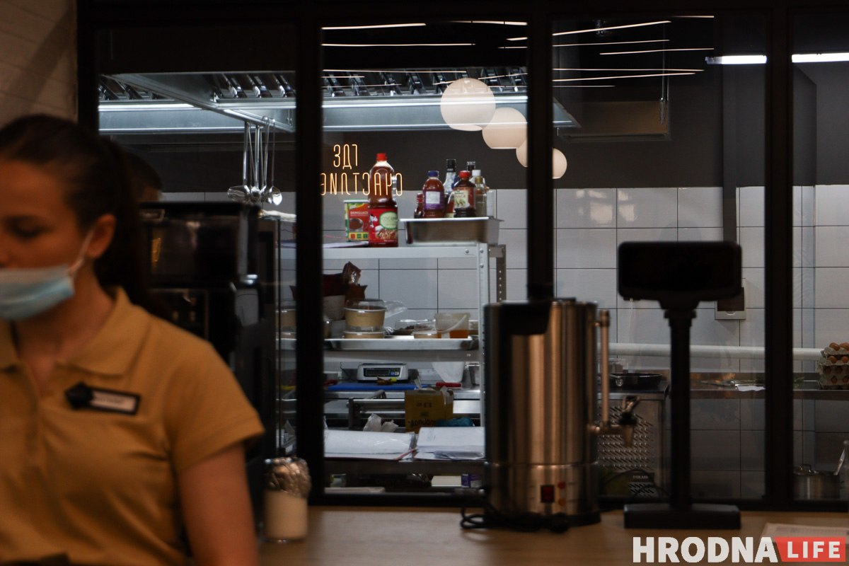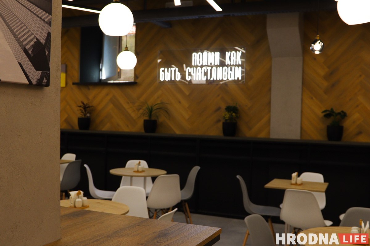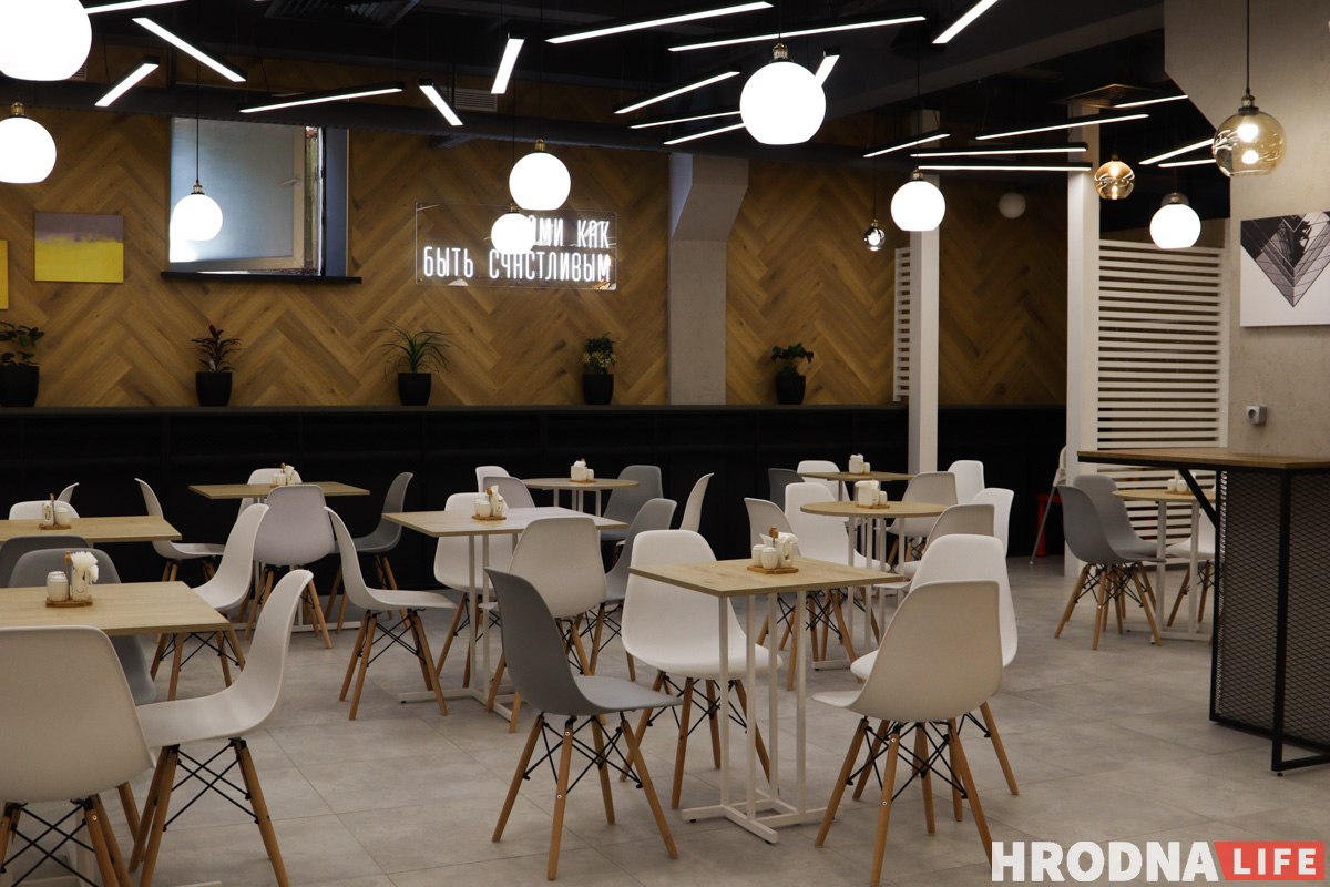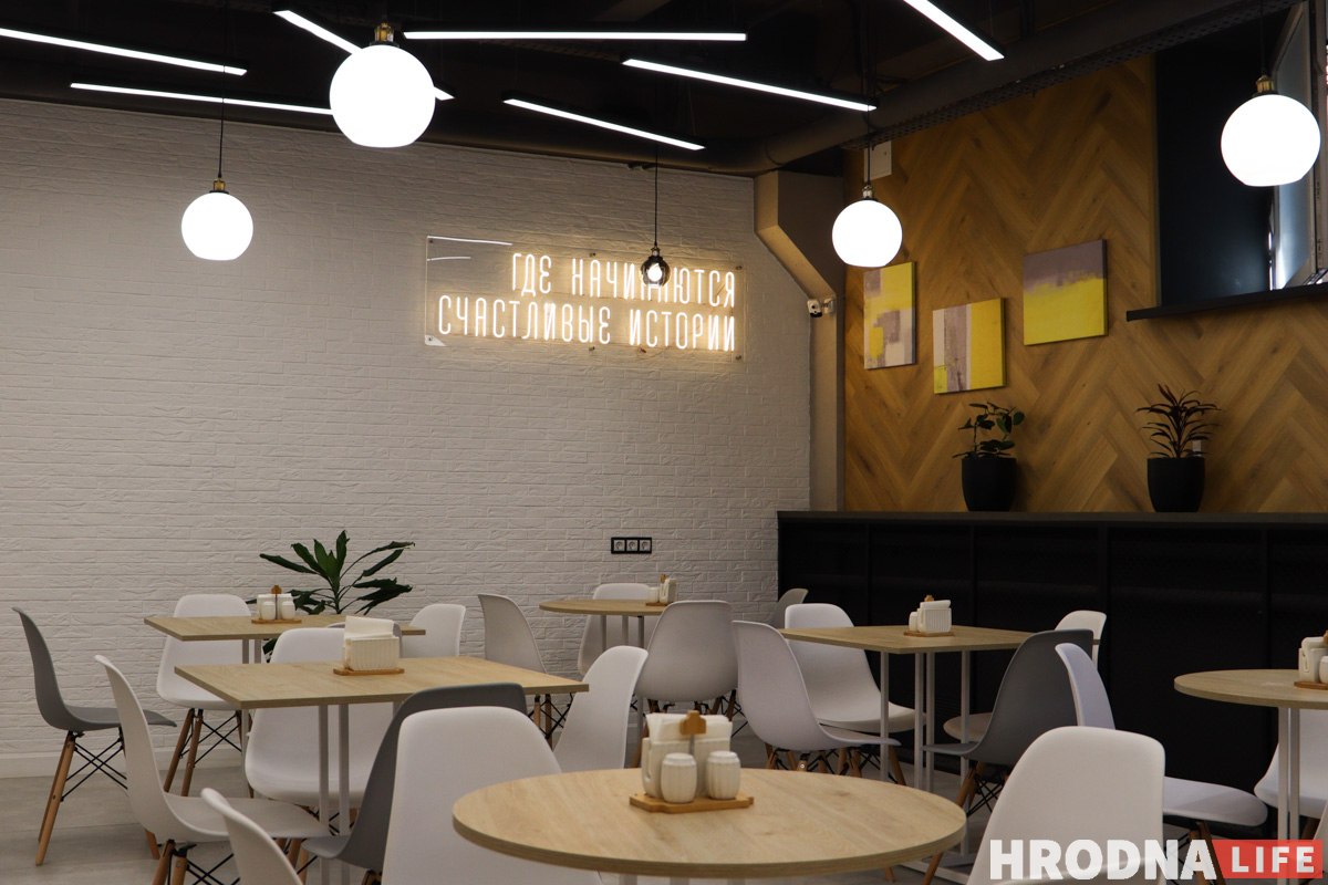 У кожнай фуд-канцэпцыі свая зона, іх вылучылі адмысловымі таблічкамі з назвамі. Памяшканне падзялілі на дзве залы: у зале кавярні 26 пасадачных месцаў, у другой зале – 45.