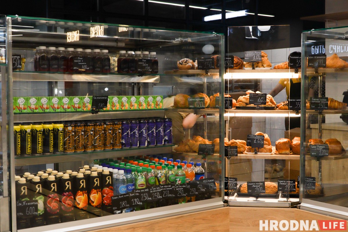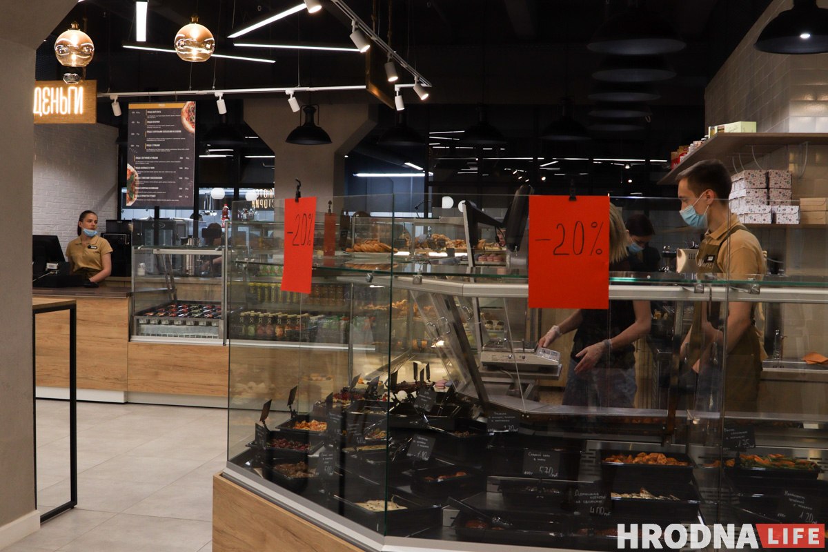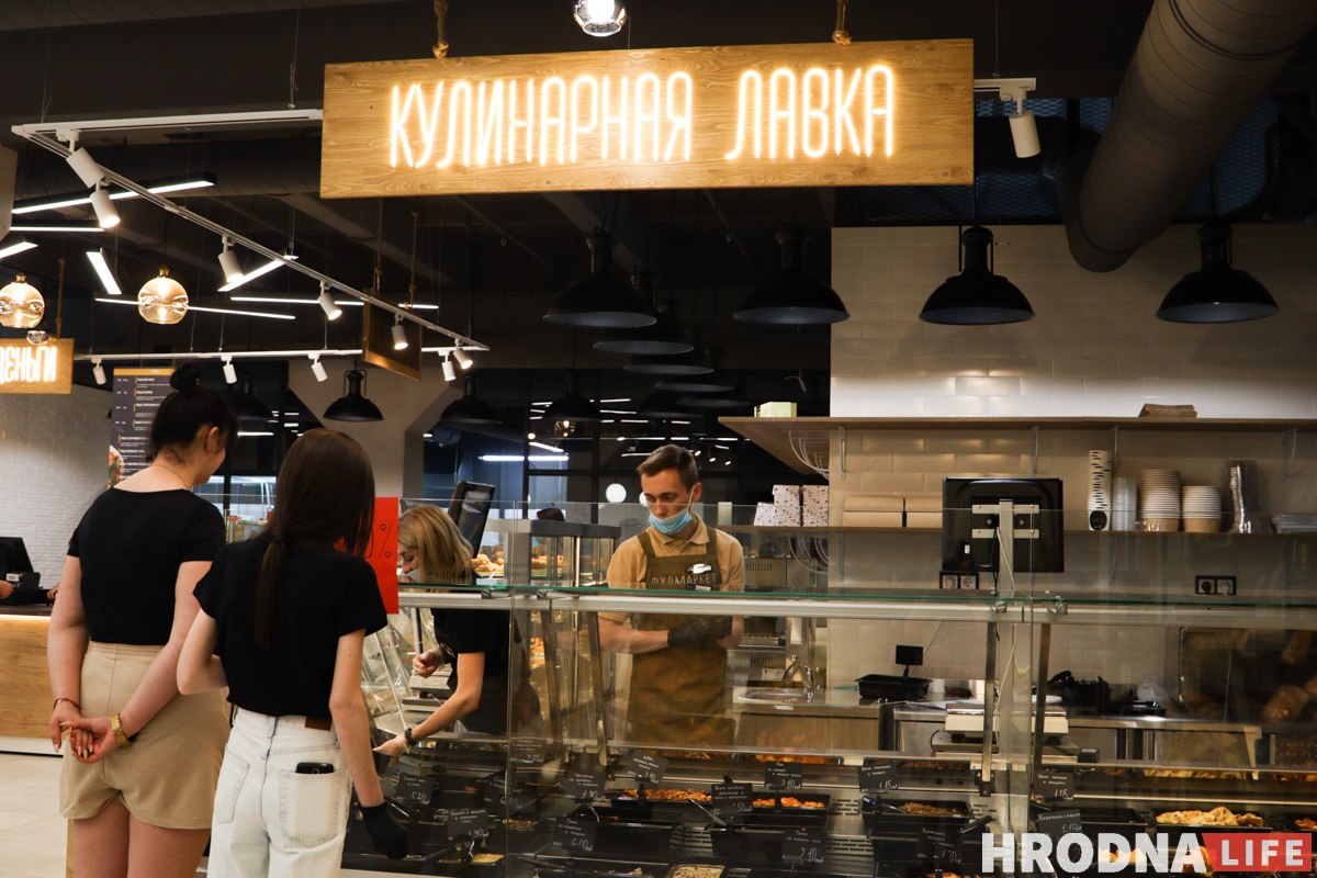 «Фудмаркет» працуе пакуль у тэставым рэжыме, таму цягам 10 дзен пасля адкрыцця тут дзейнічае зніжка 20% на ўсё, акрамя прадукцыі ў маркеце і напояў.