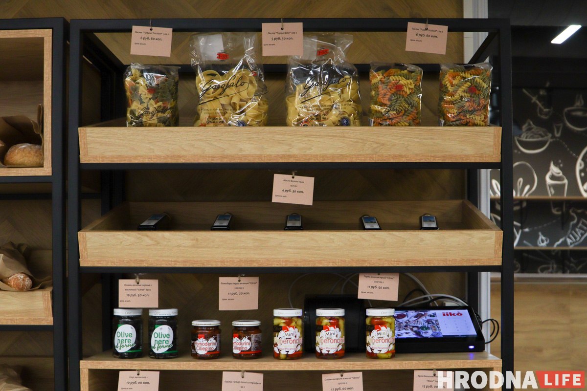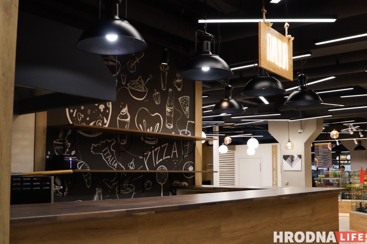 Прастору новай установы падзялілі на чатыры зоны: кавярня, піцэрыя, кулінарная крама і маркет.