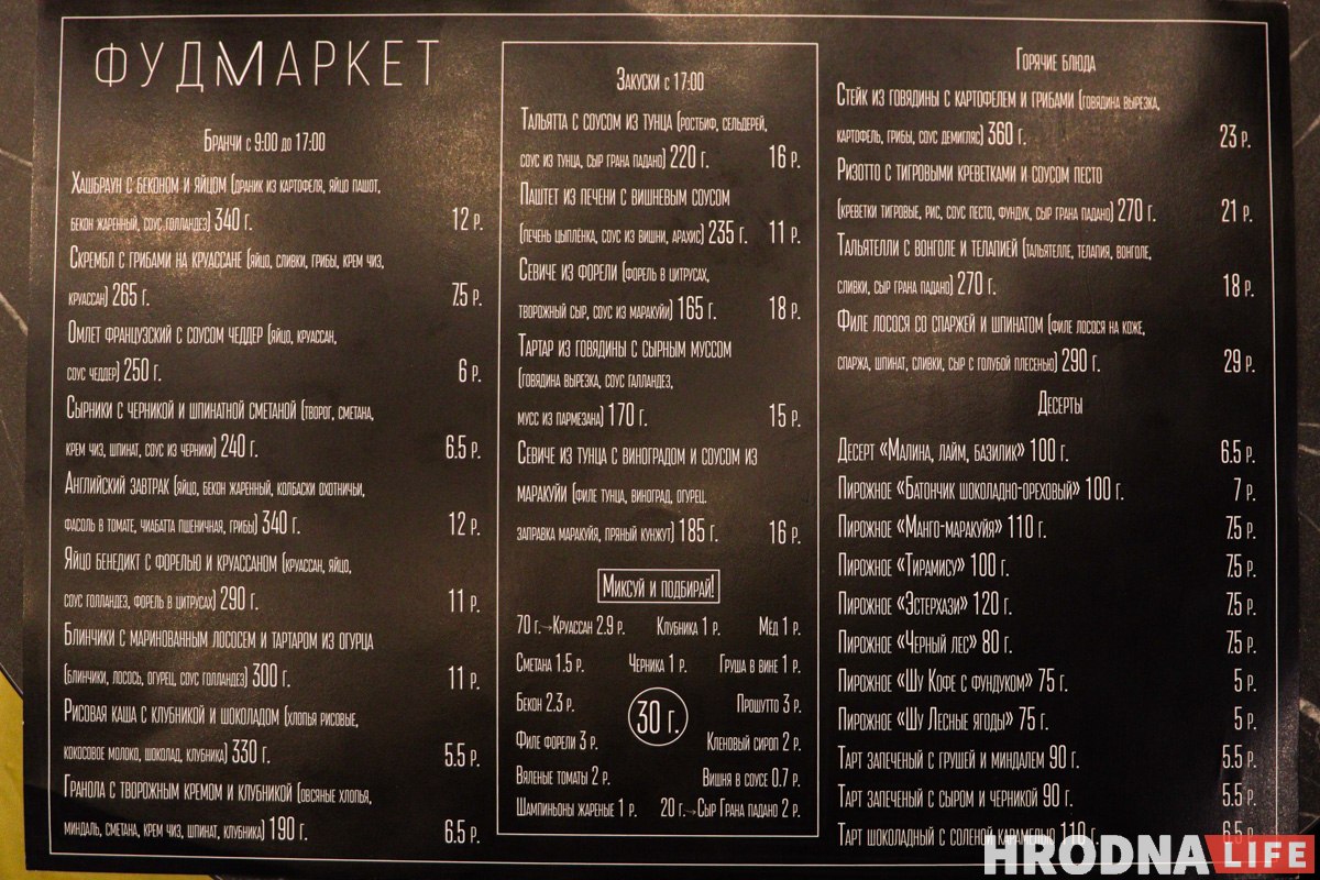 Меню ў новай фуд-прасторы распрацаваў брэнд-шэф з Мінска Раман Рагаўцоў. «Задача была дастаткова складанай, бо трэба было распрацаваць і заказныя стравы, і сняданкі, і вячэрнія стравы». Гэтага чалавека каманда ўстановы вельмі доўга шукала, пакуль адзін з кандыдатаў не сказаў, што ў яго ёсць такі знаёмы.