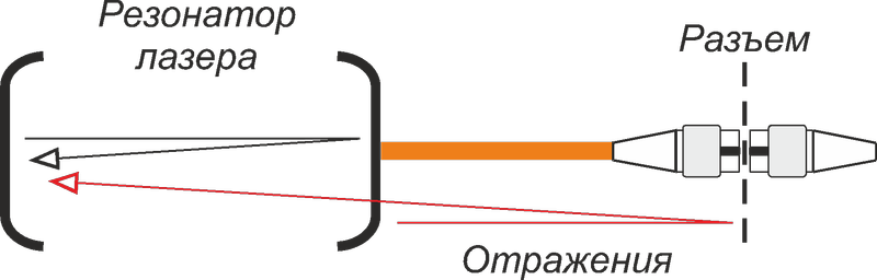Второй нежелательный эффект от обратных отражений в разъемах – нарушение работы полупроводникового лазера. Это происходит из-за того, что дополнительно к штатному резонатору лазера появляется внешний паразитный резонатор, определяемый френелевскими отражениями в точке подключения шнура к линии. Данный эффект поясняет эскиз, а его отрицательные последствия проявляются в значительных искажениях формы импульса передаваемого сигнала вплоть до его дробления на несколько частей.