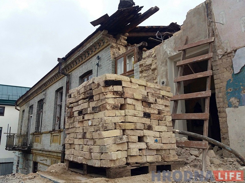 Строители рассказали, что часть здания снесут и достроят новую. Старые кирпичи не вывозят, а тщательно разбирают и складывают около объекта. В будущем они предусмотрены для реконструкции.