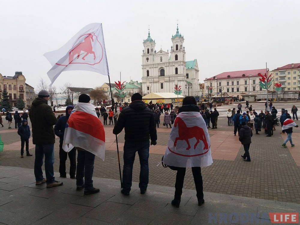 Несколько человек с флагами ОГП, БХД и бело-красно-белым флагом собрались в воскресенье 19 февраля в 14.00 на ступеньках дворца культуры текстильщиков. Они кричали «Жыве Беларусь» и «Нет декрету №3 — Лукашенко уходи!».