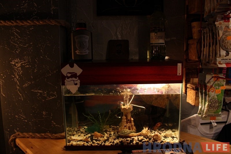 Создавать интерьер помогали представители клуба Grizzly, которые много путешествуют. Кто-то доску на стену привез, кто-то картину. Недавно в баре появился аквариум с рыбками. В Grizzly House есть как алкогольные напитки, так и безалкогольные, кофе, соки, закуски.