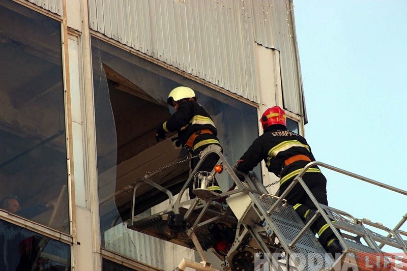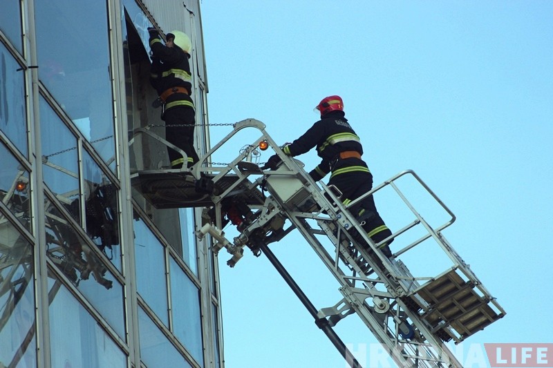 Территория у входа в магазин была быстро оцеплена еще до приезда сотрудников МЧС. Они поднялись на вышке и убрали осколки стекла на последнем этаже торгового дома.