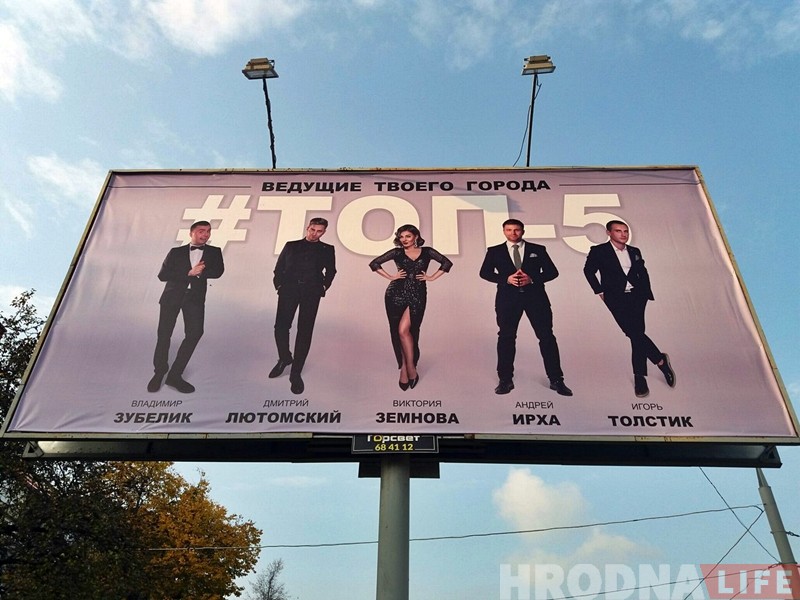 На одном из билбордов на улице Горького в середине октября появился плакат с изображением гродненских ведущих, которые подписаны как ТОП-5 в Гродно. В список не включили известного ведущего Дмитрия Чекана, а те, кто попал на билборд, выбрали себя сами, не проводя никакого опроса. Hrodna.life попытался разобраться в ситуации.