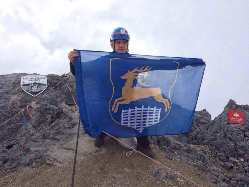 На пике высотой в 4 884 м Вадим Фролов развернул флаги Беларуси и Гродно. В тот день, кроме белорусского, на пике были еще два флага: российский и украинский.